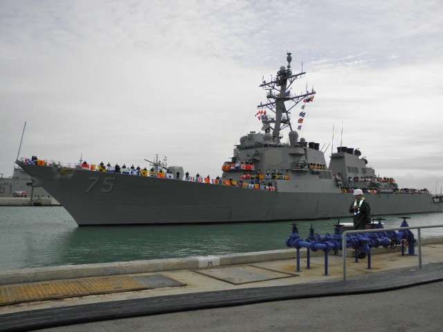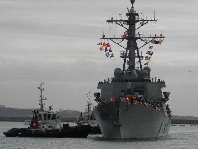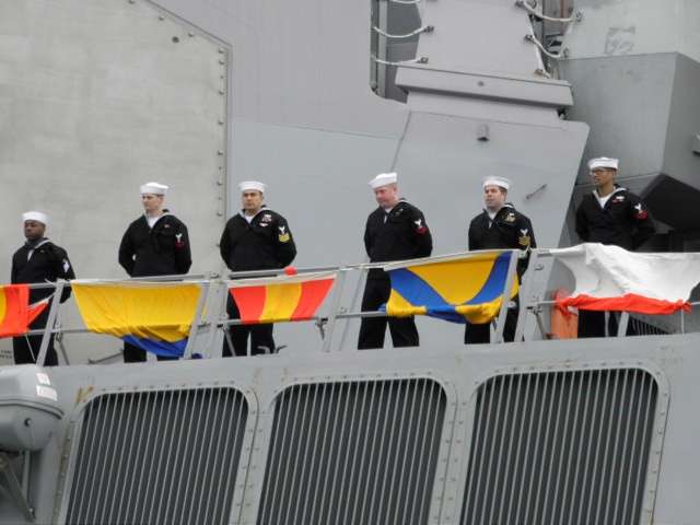 El almirante de la Flota, Santiago Bolívar, y el jefe de mando de las Fuerzas navales de Estado Unidos en Europa y África, comandante Bruce W. Glingan, fueron los encargados de dar la bienvenida al Donald Cook deseando a la tripulación una buena estancia en la Base de Rota y animándolos a salir a la calle, pasear, relacionarse con la gente de la bahía de Cádiz y experimentar ese intercambio de culturas que la villa lleva viviendo desde hace 60 años. Las buenas relaciones que siempre han primado entre la Armada Española y la Americana y la hospitalidad de los roteños son un buen comienzo para este nuevo destino, aseguraba el almirante.
