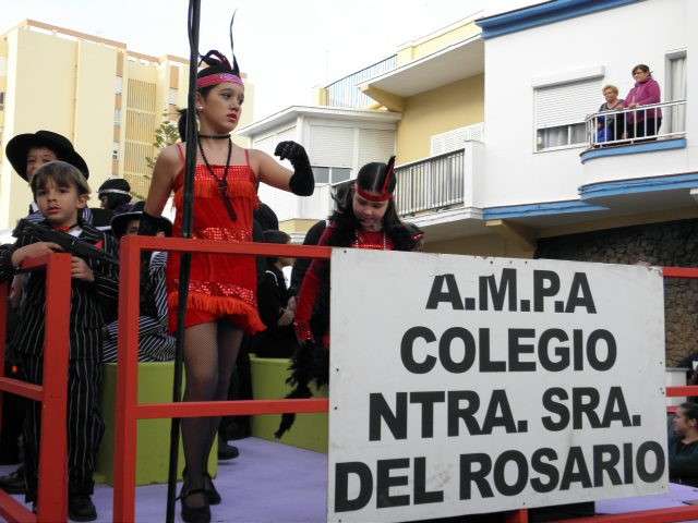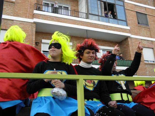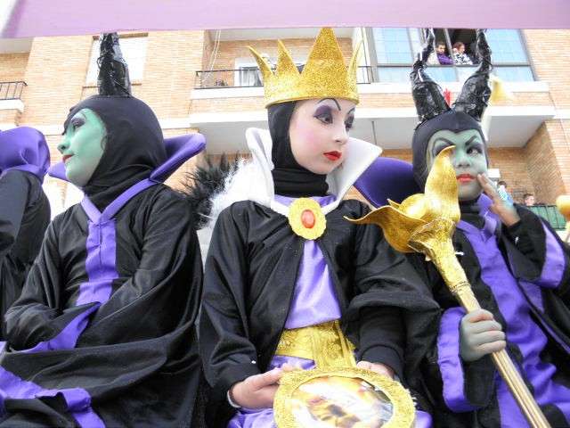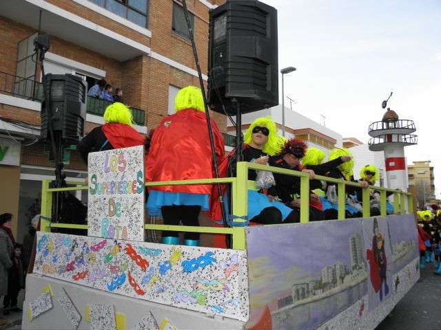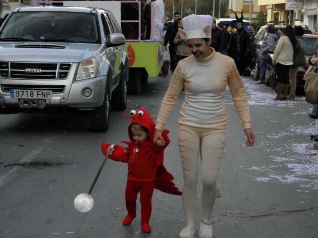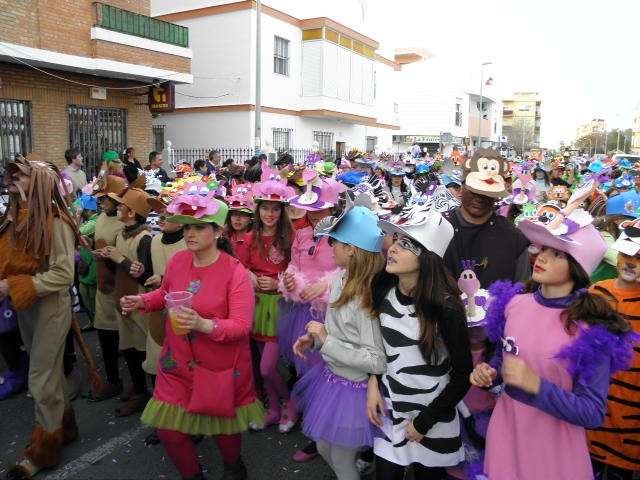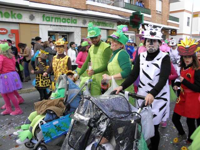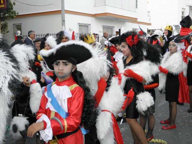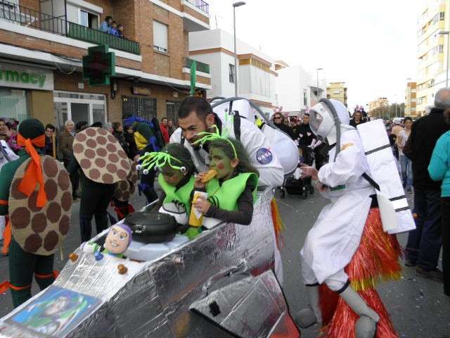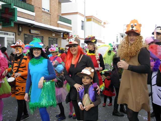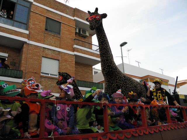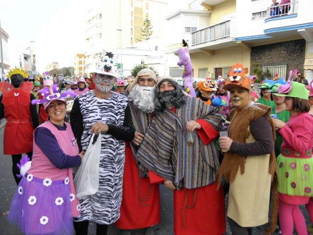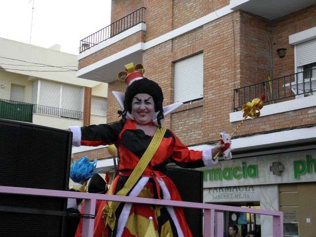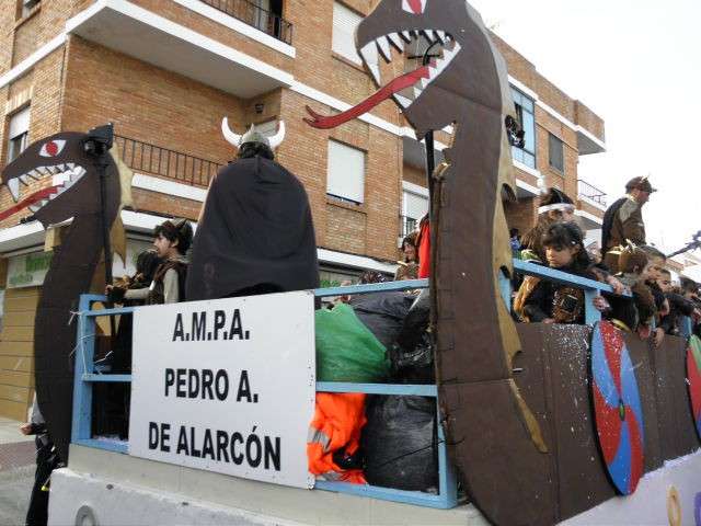 Los vikingos, gánters y cabareteras, animales de un gran arca de Noé, personajes de cuentos como Alicia en el país de las maravillas, madrastras, piratas, superhéroes, hadas y dragones, y un largo etcétera han desfilado encarnados por los colegios Pedro Antonio de Alarcón, Nuestra Señora del Rosario, Maestro Eduardo Lobillo, Pozo Nuevo, Nuestra Señora del Perpetuo Socorro, Luiz Ponce, Azorín, San José de Calasanz, así como la Asociación de Discapacitados, la peña carnavalesca "La Media Luna" y el pregonero de este Carnaval 2014, Enma Ortiz, que se ha sumado con una buena trupe de exploradores y pequeños animales de la selva. A todos ellos, había que añadirles representantes de agrupaciones como "Los aburríos de Janeiro", "Las damas del Rosario", "Los curanderos", algunas "Aeroniñas internacionales", y otros tantos de "Los del Almirante" y rocieras. El largo cortejo, que tardaba casi 45 minutos en pasar por delante de los muchos ciudadanos que hoy han salido a la calle, se completaba con originales disfraces de grupo y parejas que han hecho reír al público que desde el otro lado de la barrera, también despedía este Carnaval 2014.