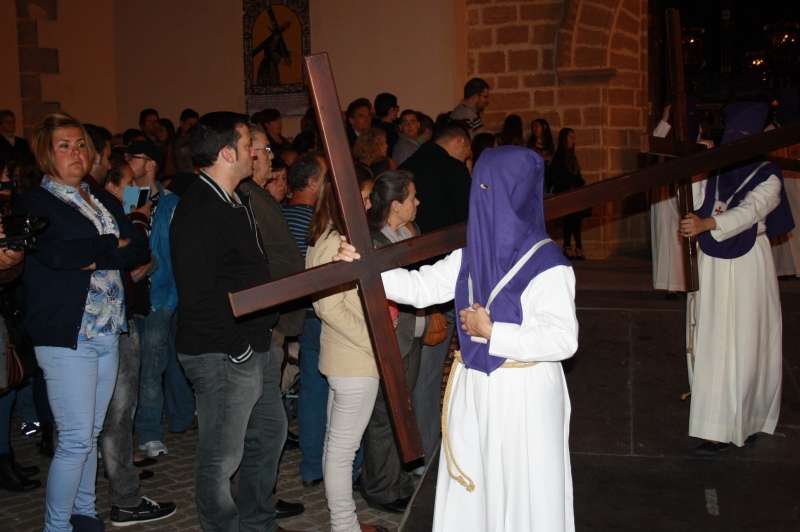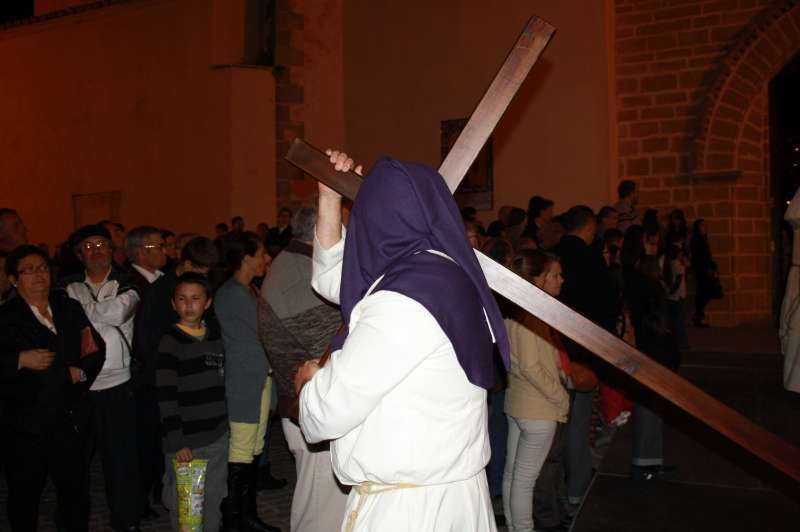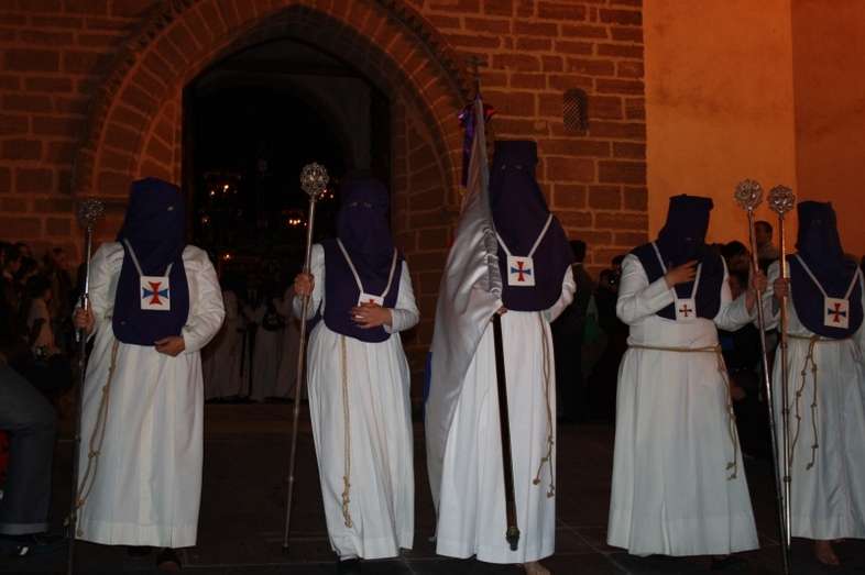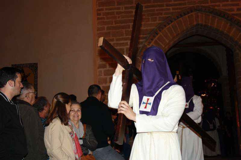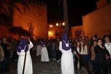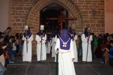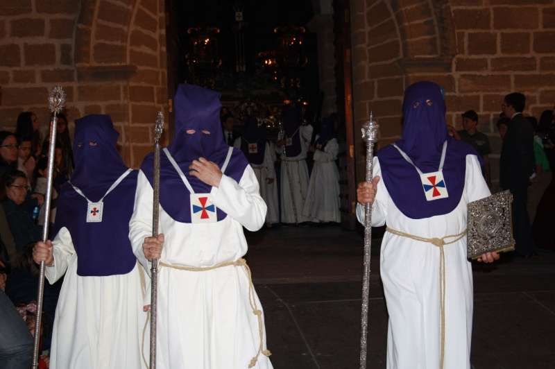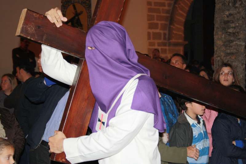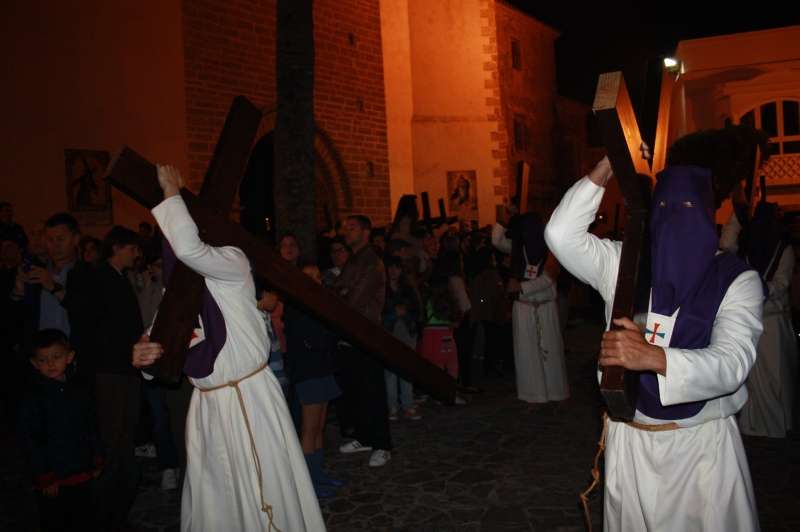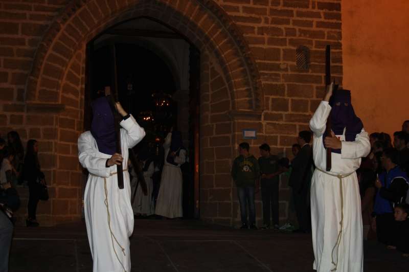 A las diez y media se abría la puerta de la parroquia de Nuestra Señora de la O para dejar pasar la cruz de guía que abre el cortejo compuesto por hermanos que cargan una pesada cruz en señal de penitencia. Más de 350 cofrades, entre nazarenos con cruces, hermanas de vela y un pequeño tramo de hermanos con cirios que este año se ha introducido para permitir que aquellos devotos que por edad o condiciones físicas no puedan cargar el peso de una cruz puedan acompañar a Jesús Cautivo, discurrieron  por las calles de la villa dando realce a esta salida.