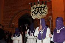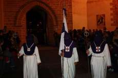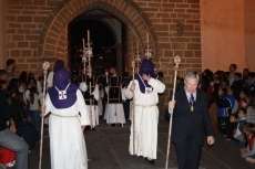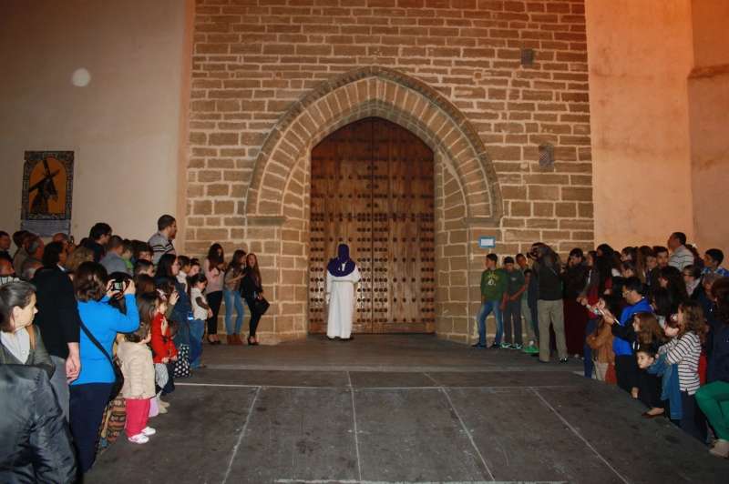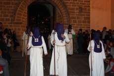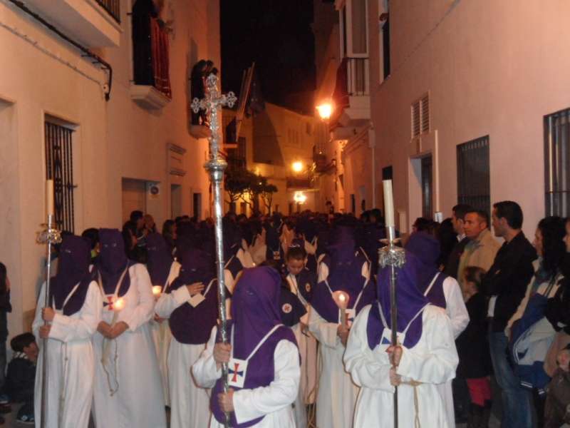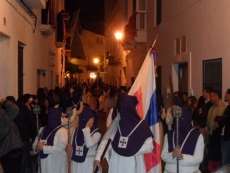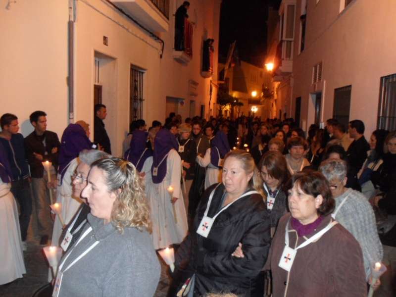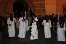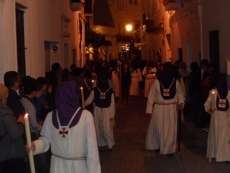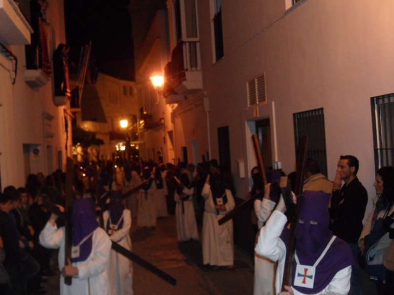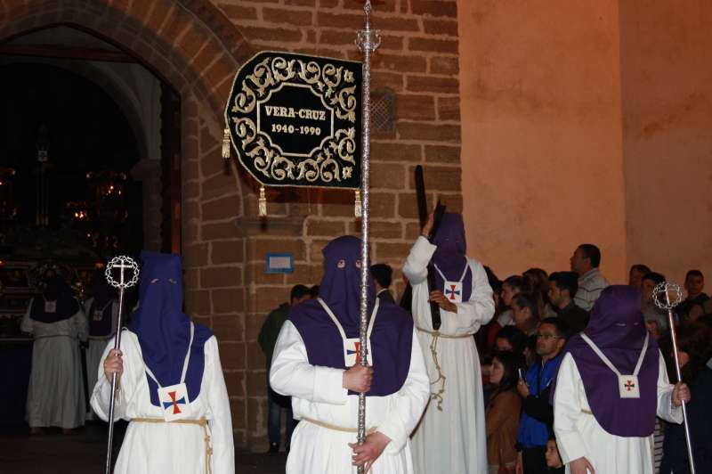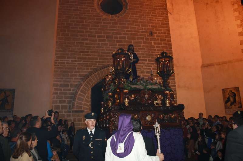 A las diez y media se abría la puerta de la parroquia de Nuestra Señora de la O para dejar pasar la cruz de guía que abre el cortejo compuesto por hermanos que cargan una pesada cruz en señal de penitencia. Más de 350 cofrades, entre nazarenos con cruces, hermanas de vela y un pequeño tramo de hermanos con cirios que este año se ha introducido para permitir que aquellos devotos que por edad o condiciones físicas no puedan cargar el peso de una cruz puedan acompañar a Jesús Cautivo, discurrieron  por las calles de la villa dando realce a esta salida.