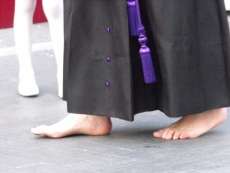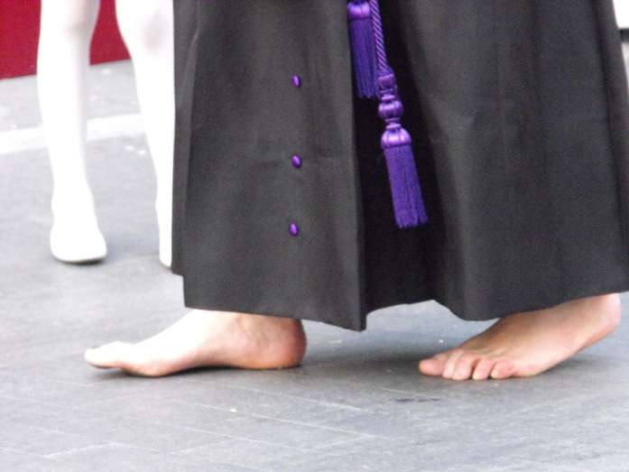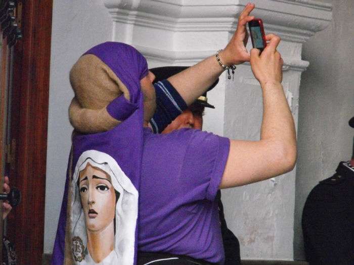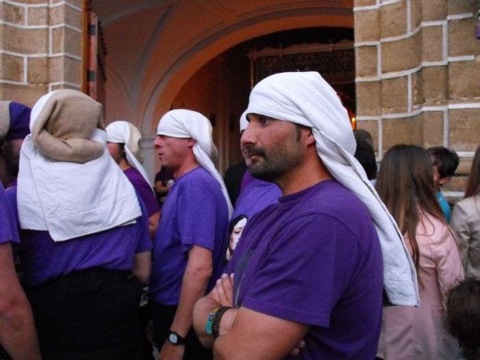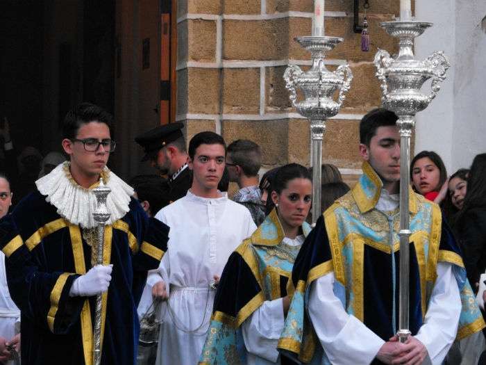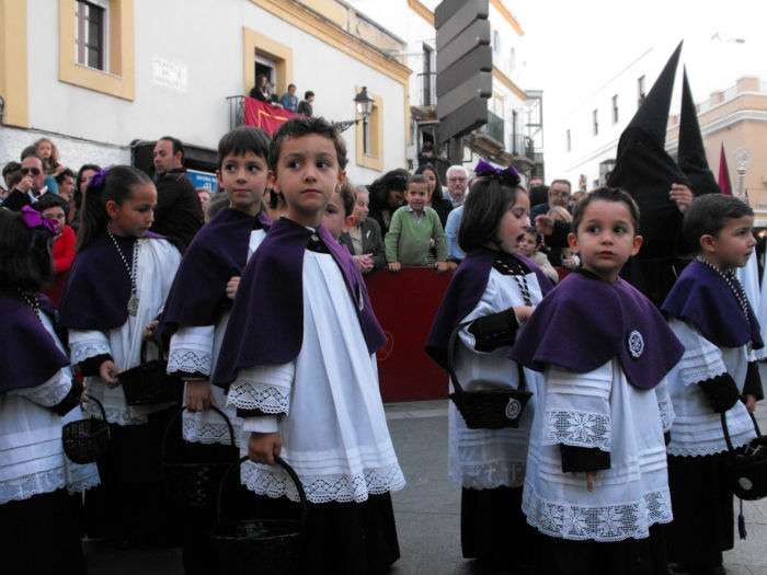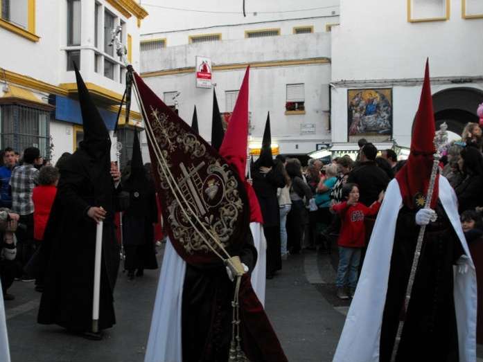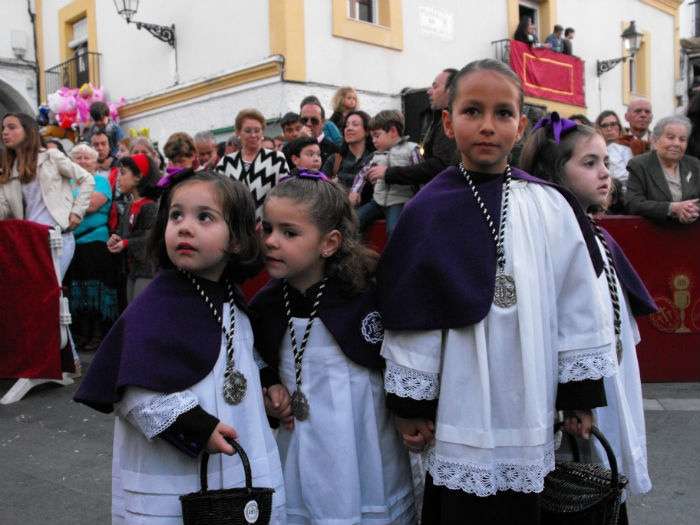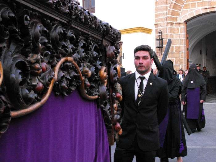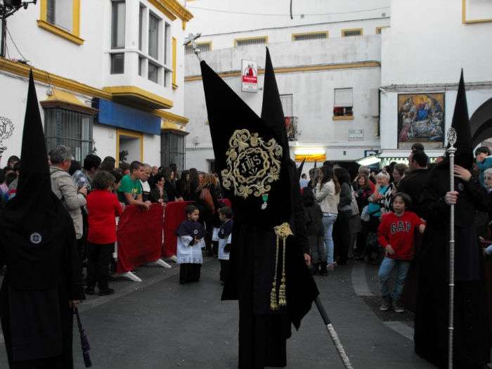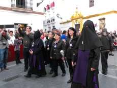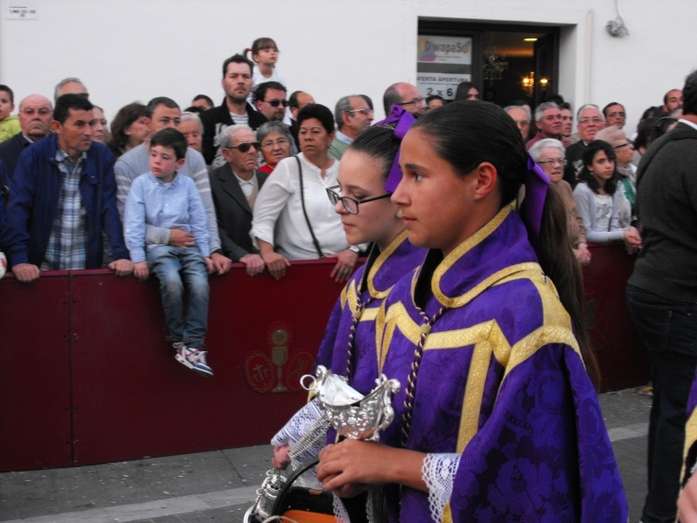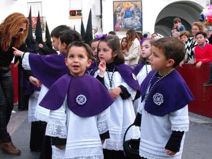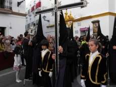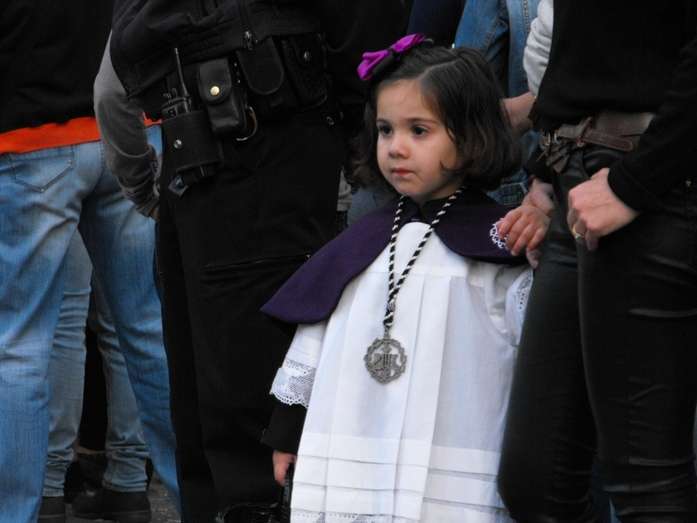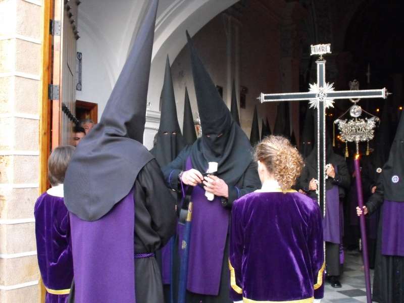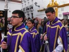 Con el Cristo ya en la calle, seguían pasando hermanos nazarenos hasta completar los más de 250 penitentes que acompañan a esta cofradía. Llama especialmente la atención la presencia de jóvenes en el cortejo gracias a la sección juvenil de la hermandad que viene pisando fuerte y que asegura cantera suficiente para que la Salud tenga continuidad. En este mismo cortejo un grupo de pequeños de no más de 5 años con canastas repartiendo algunos caramelos pusieron la nota más espontánea de una hermandad que luce por su seriedad.