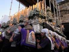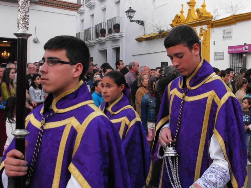 Tras el paso del cuerpo de acólitos y una representación de la Hermandad de Los Dolores con quien comparten sede canónica, asomaba por la capilla la Virgen de la Caridad y San Juan Evangelista. Las dimensiones del palio hacen que sea imposible que los costaleros se mantengan debajo del paso con lo que las maniobras necesarias para salir a la calle llevaron un tiempo considerable que hizo a los presentes admirar el trabajo de una cuadrilla bien llevada pro Julio Villalba López que hacía su primera estación de penitencia. Primero de rodillas y luego por los laterales, el paso palio fue sacado de la Caridad. Una vez en la calle, a pulso, y con una nueva saeta de Nogales planeando en el ambiente, la cuadrilla levantó a su titular con algún que otro tambaleo que puso el alma en vilo de los presentes. Finalmente, la maniobra concluyó y la cuadrilla de costaleros recibió el aplauso de un público agradecido. Con los costaleros bajo las trabajaderas, María Santísima de la Caridad que ayer estrenaba una blonda de anticuario, iniciaba también su recorrido por las calles de la villa acompañada por las marchas fúnebres que la banda de música "Fernando Guerrero" de Los Palacios le dedicó a lo largo de toda su estación de penitencia.