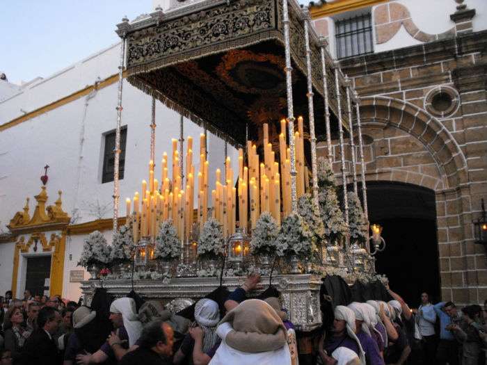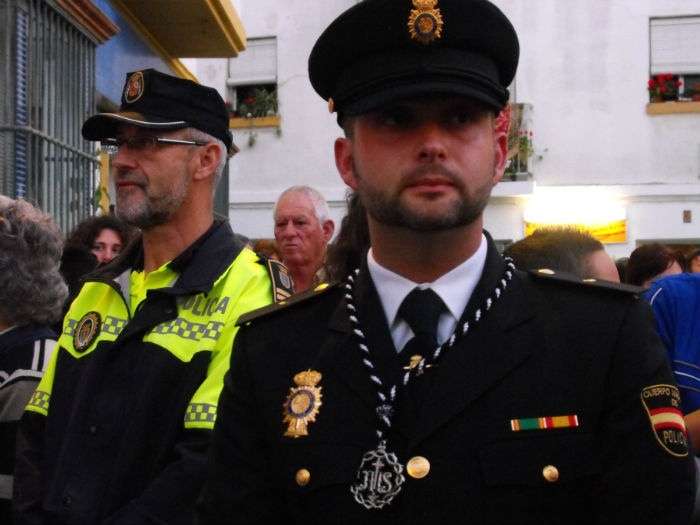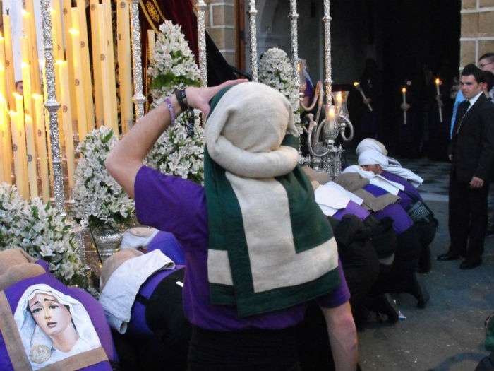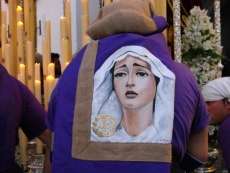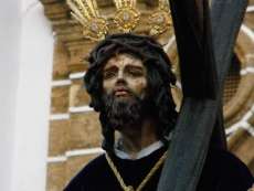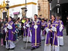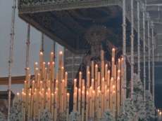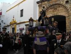 Partía la cruz de guía puntual a las 20.30 horas y le seguían los hermanos nazarenos con cirios, varas o portando las insignias más destacadas de la hermandad. Acompañado de capilla musical, salía en primer lugar por el dintel de la capilla de la Caridad Nuestro Padre Jesús de la Salud que ayer estrenaba túnica morada, camisa interior y los faldones en terciopelo morado de Lyon de su paso. Esta imagen procesionaba cumpliendo 50 años desde su talla y estrenaba el Calvario que completa este conjunto iconográfico en el que se representa a Jesús en su tercera caída con la cruz a cuestas ayudado por dos ángeles que lo sujetan y lo ayudan a levantarse para continuar el camino. Las dificultades que entrañan lo estrecho de la puerta de la capilla hace que la labor de la cuadrilla de costaleros sea digna de admirar. Salen de rodillas tras varias maniobras complicadas que dirige el capataz Joaquín Bandarra Martínez que lleva 28 años al frente de este cargo. Ayer además, el saetero roteño Agustín Nogales dedicaba una saeta al titular de La Salud cuando este enfilaba los primeros pasos de su estación de penitencia flanqueada, al igual que la virgen, por dos policías nacionales que acompañan a aquellas hermandades que lo solicitan.