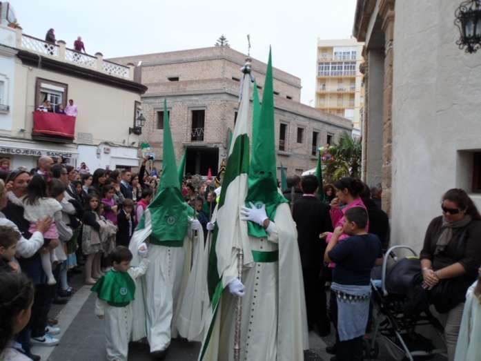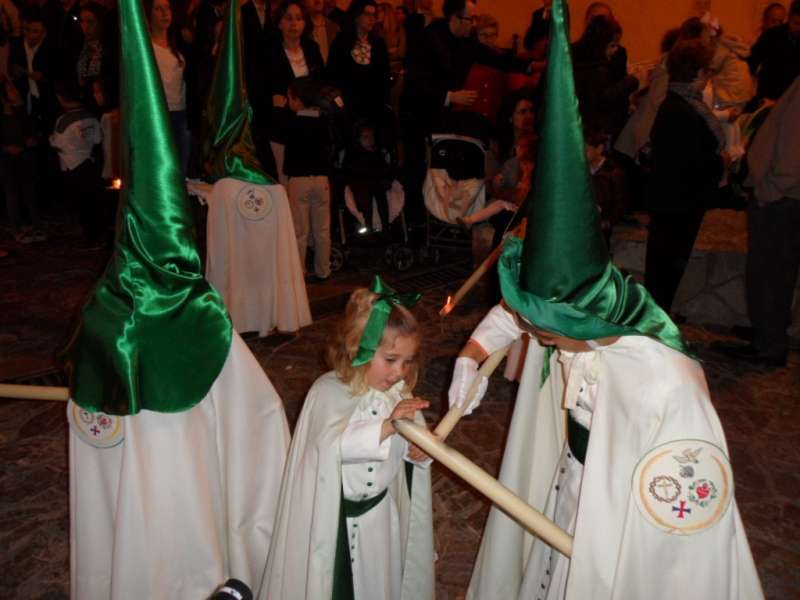 A las siete y cuarto de la tarde partía de la capilla de San Roque la cruz de guía que abría paso a un cortejo formado por unos 130 hermanos nazarenos con túnica blanca, capa blanca y antifaz verde, para recorrer las calles de la villa. Comenzaba la recta final de unos días de conmemoración de la pasión, muerte y resurrección de Jesús coincidiendo con la jornada festiva que siempre invita a salir a la calle a un mayor número de ciudadanos.