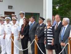 Autoridades civiles y militares presentes en el arriado solemne con motivo del Día de las Fuerzas Armadas