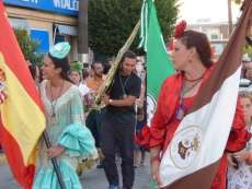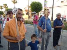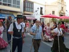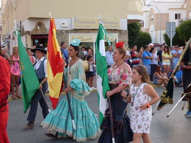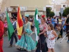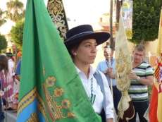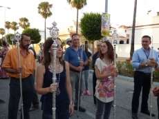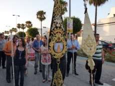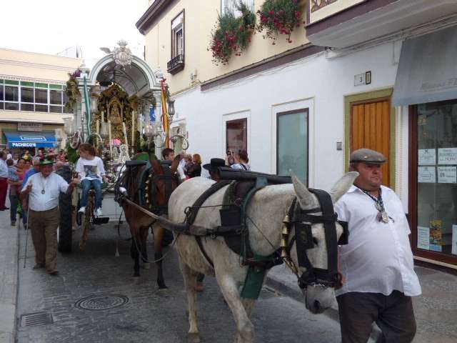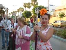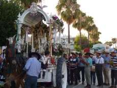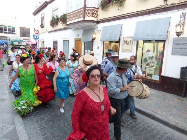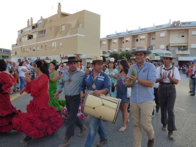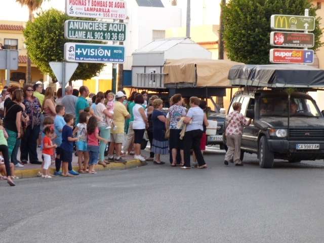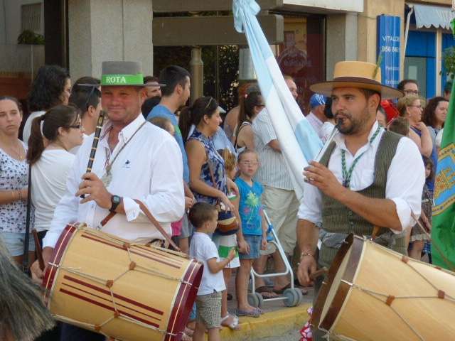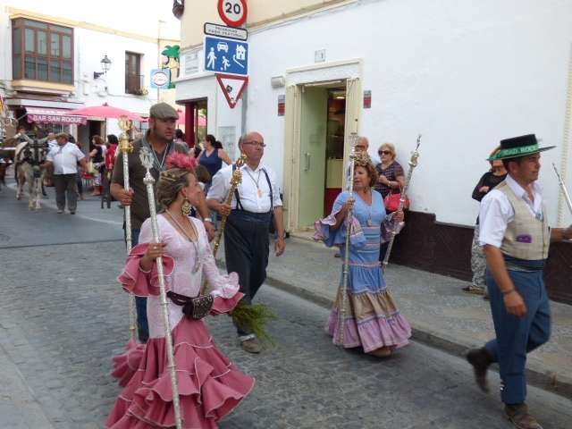 Fue en el último tramo de la avenida de la Libertad donde los rocieros organizaron la comitiva con el reparto de banderas y estandartes para hacer su llegada a Rota, acompañados además por representación de la Hermandad del Amor, con quien comparte sede canónica, y del Santo Entierro con quien se hermanó hace unos años. Este año, sin caballos que abrieran el cortejo, tan sólo uno, los romeros se dispusieron a afrontar el último tramo. Pese al cansancio acumulado por nueve días de mucha intensidad, sus gargantas todavía alcanzaban para ir dedicando canciones y sevillanas a la virgen llamando la atención de los ciudadanos que los esperaban en los puntos de mayor trasiego, algunos de ellos, repartiendo las tradicionales ramas de romero.