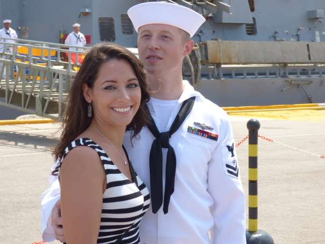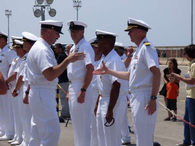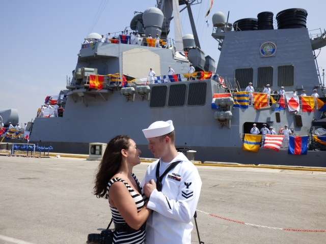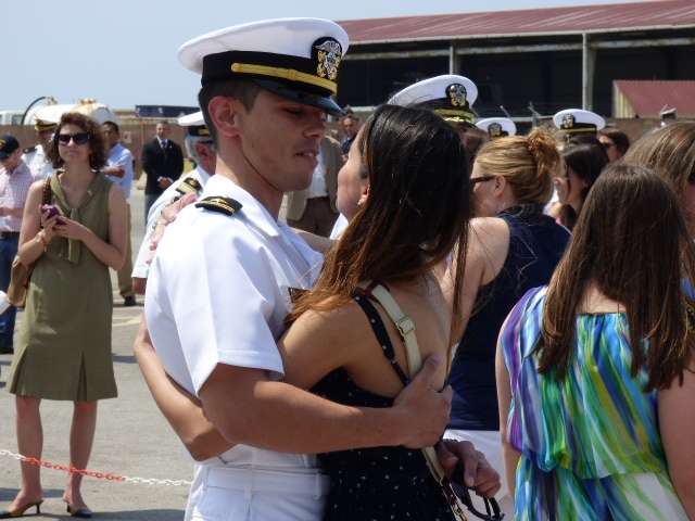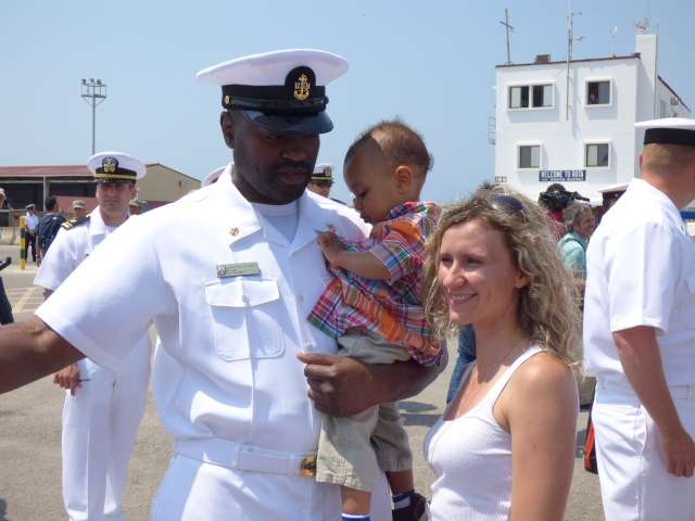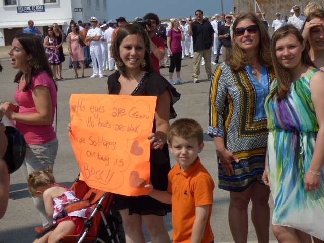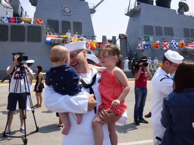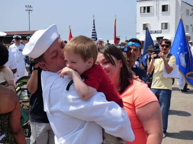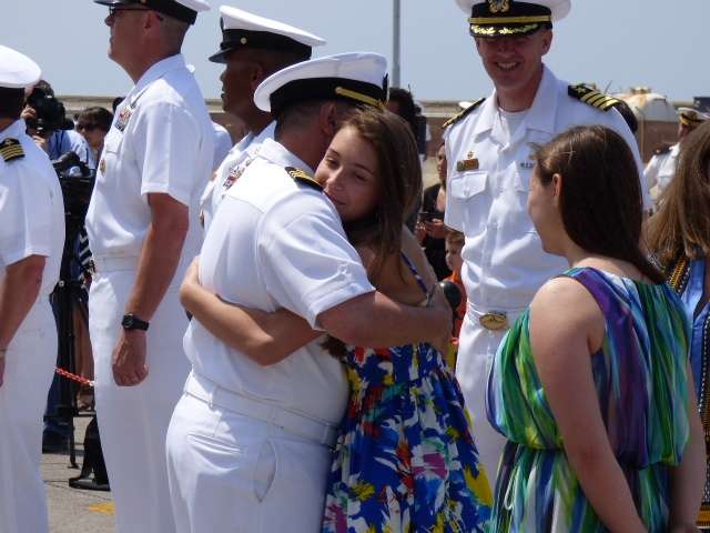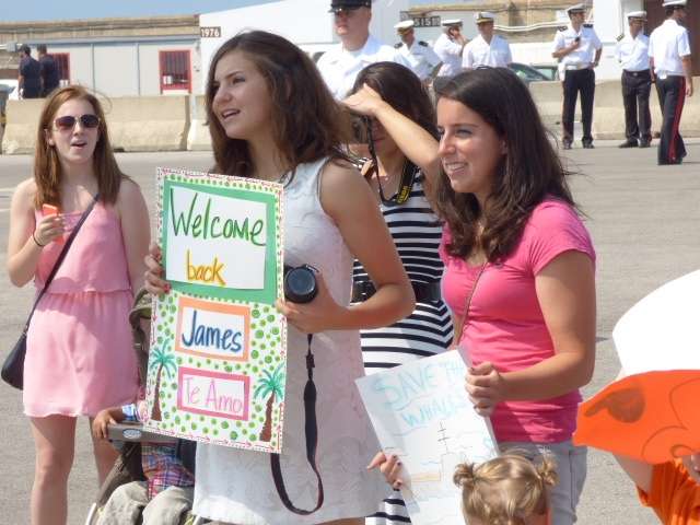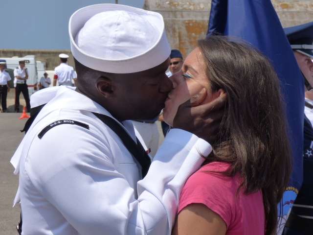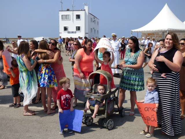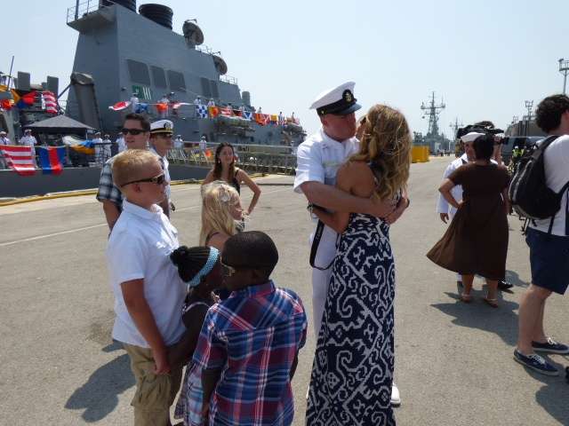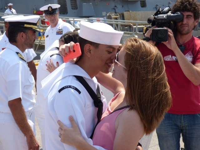 Una vez en tierra el comandante del "USS Ross" junto a su grupo de capitanería, se han vivido una de las estampas más entrañables de este tipo de actos. El reencuentro de familias que esperaban ansiosas a su padre, novio o marido. Besos, abrazos y fotos para el recuerdo han quedado inmortalizadas no sólo por los medios de comunicación allí presentes sino por los propios protagonistas de la historia. Esta vez ha sido un recibimiento algo más numeroso y caluroso que el anterior donde los familiares han alzado carteles en inglés y español que rezaban "Te echamos de menos", "Te quiero papá" o "Bienvenido a casa". Los tripulantes de este destructor antimisiles partían el pasado 3 de junio de la base de Norfolk (Virginia) con destino a Rota donde se han encontrado un día soleado y una bienvenida oficial con compañeros de la Armada americana y española.