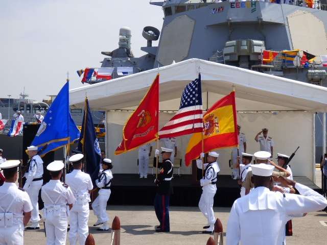 Tras el recibimiento inicial, y el acto de recepción por parte de las autoridades militares, comenzaba la ceremonia de bienvenida con el desfile de banderas por el recinto acotado y se oían los acordes del himno nacional español y estadounidense interpretados por la banda de música de la US Navy y del tercio Sur de San Fernando. Tras la invocación religiosa, en la que se dejaba claro que esta colaboración entre dos países perseguía promover la paz en el mundo y se pedía protección para las personas que trabajarán en ello, comenzaban los distintos discursos.