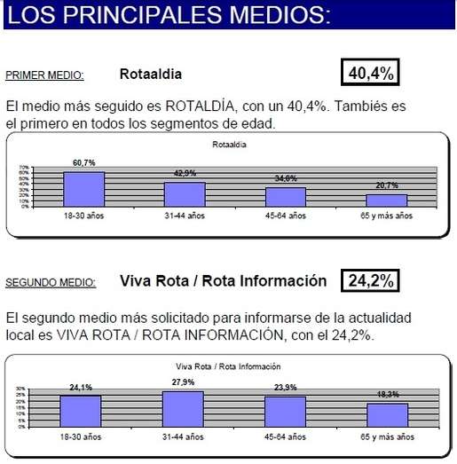 Con estos datos sobre la mesa, recogidos en la encuesta encargada por el Ayuntamiento de Rota (pregunta 14, pag. 55), Rotaaldia.com demuestra que el proyecto que comenzó hace algo más de cuatro años, en mayo de 2010, se ha consolidado y ha conseguido su objetivo de mantener a la población local informada de todo lo que acontence en la localidad.