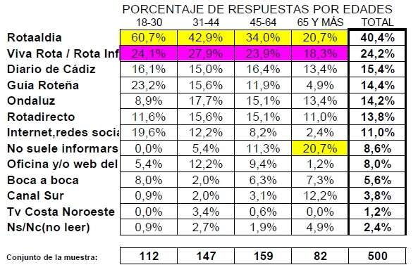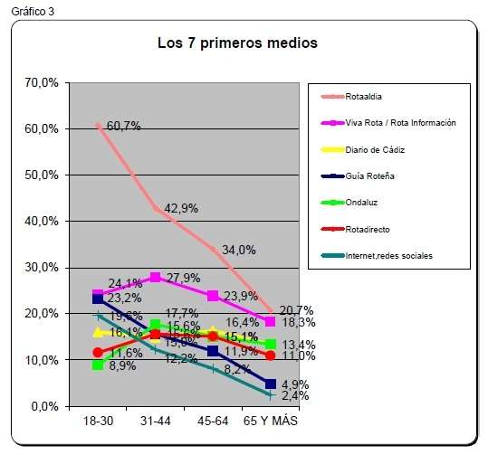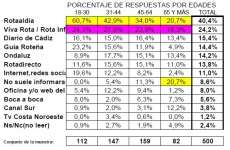 Según los datos que se reflejan tras las preguntas a los encuestados, Rotaaldia.com se posiciona además como el primer medio más leído en todas las franjas de edad manteniendo una considerable ventaja sobre el resto de publicaciones. De los resultados se desprende que de los lectores encuestados, un 60,7 por ciento tenía entre 18 y 30 años; un 42,9 por ciento entre 31 y 44 años; un 34 por ciento entre 45 y 64 años; y un 20,7 por ciento más de 65 años.