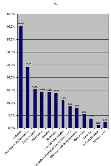 La encuesta, que recordamos estaba hecha por la empresa externa Celeste-Tel sobre una muestra de 500 llamadas telefónicas a números fijos, incluía preguntas sobre todo centradas en la gestión municipal de Partido Popular y Roteños Unidos, aunque también incluía otras como la valoración de políticos, posibles votaciones si hubiera elecciones o los medios informativos por los que se guiaban los roteños para estar al día de la actualidad. En este último apartado, Rotaaldia.com se posiciona como líder indiscutible con un 40,49 por ciento de lectores que contestaron que este medio digital era su principal vía de información. Lejos queda el 24,2 por ciento conseguido por el periódico Viva Rota que lo sigue en segunda posición, o el 15,4 por ciento que obtiene Diario de Cádiz que se sitúa como tercero. El resto de medios de comunicación, escritos o audiovisuales se sitúan en porcentajes inferiores.