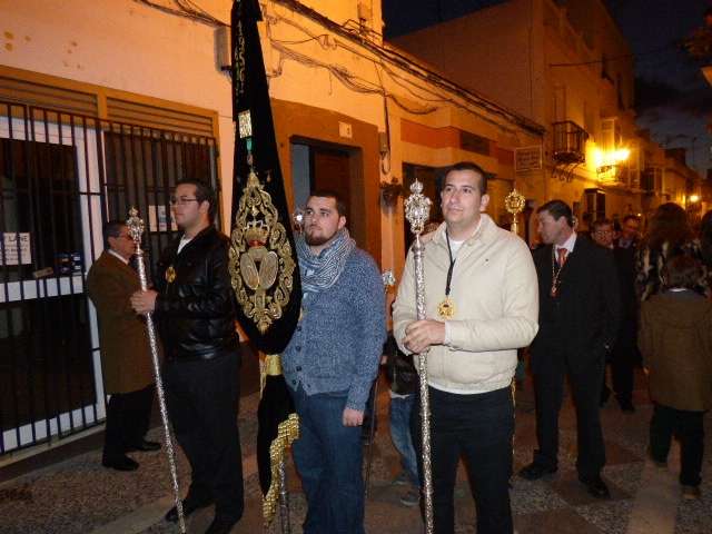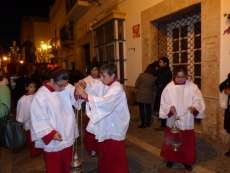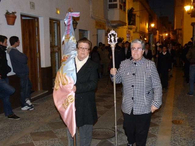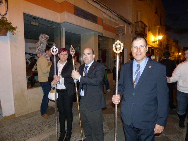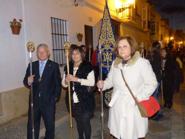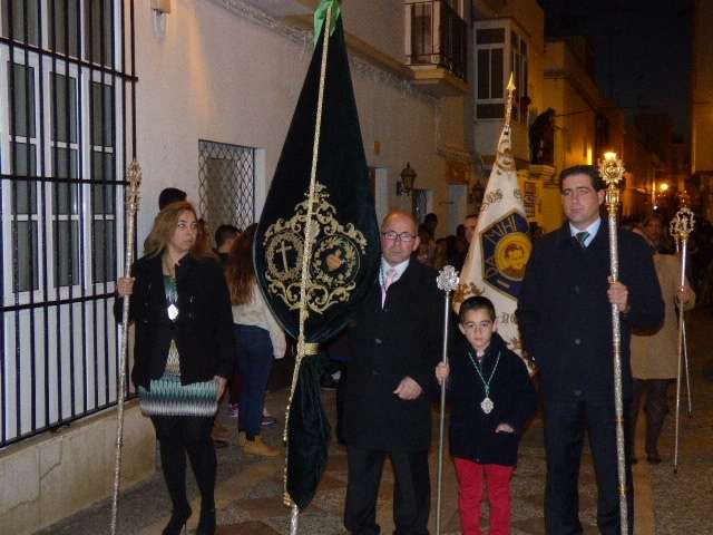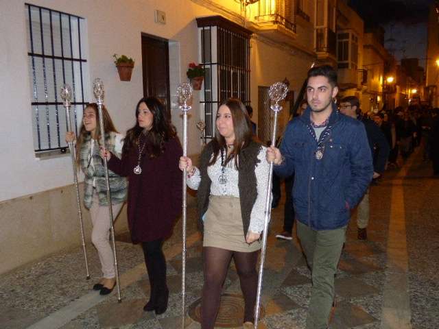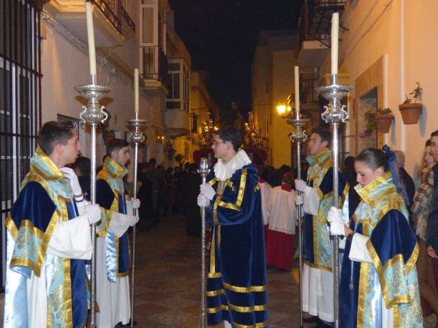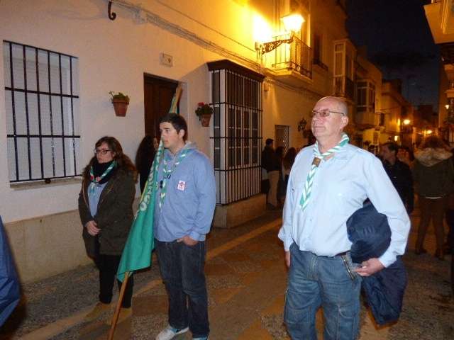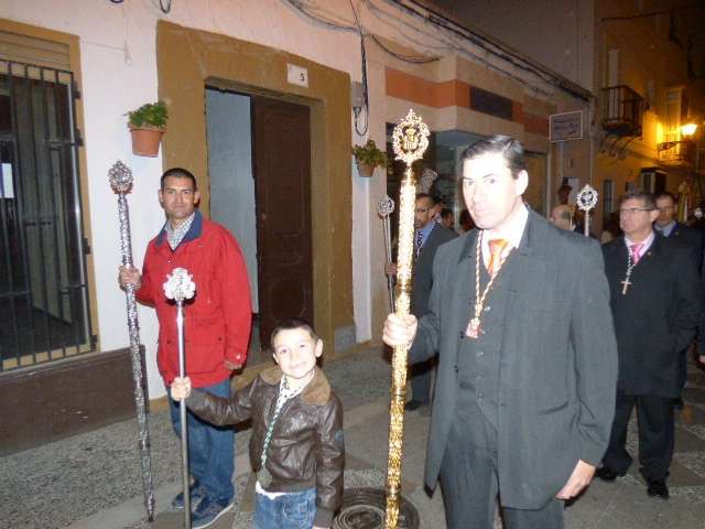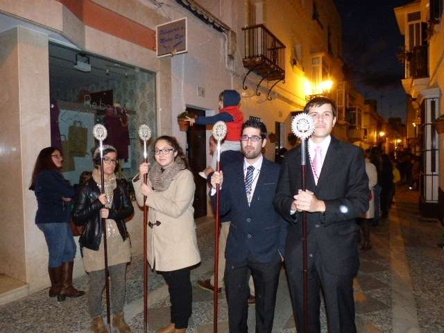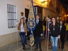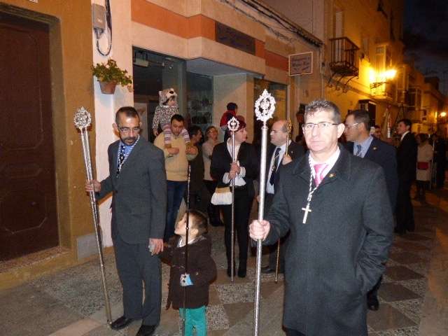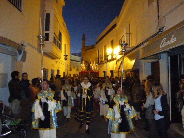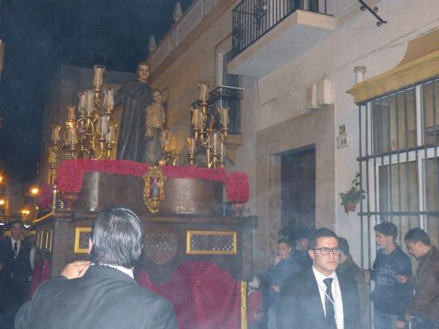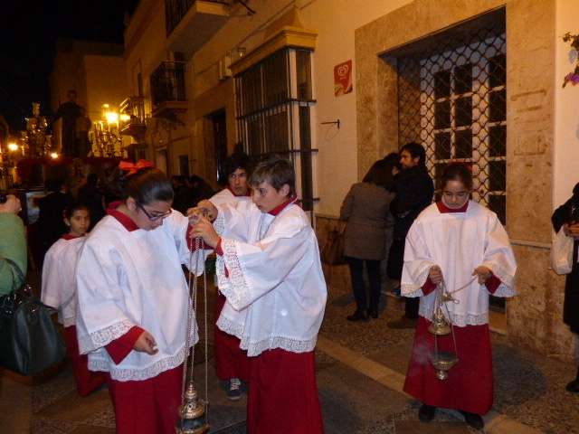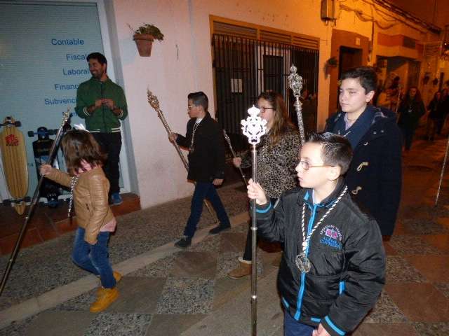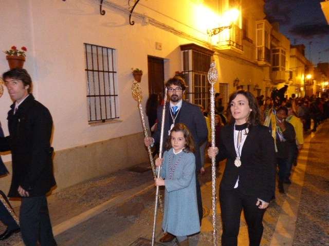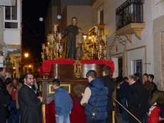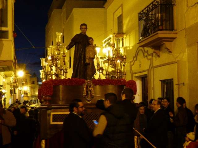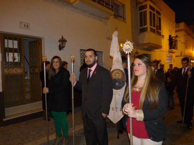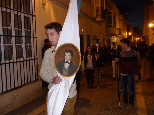Niños con banderas de colores donde se veía la silueta del santo sacerdote, alumnos y ex alumnos salesianos con varas e insignias, representantes de varias hermandades de la localidad, miembros del grupo scouts "Santo Domingo Savio", asociaciones parroquiales, Hijas de María Auxiliadora, representantes del AMPA de los Salesianos y el cuerpo de acólitos, precedían el paso de Don Bosco que lucía engalanado para la ocasión. Una cuadrilla de jóvenes costaleros de la localidad se encargaron de cargar la imagen que representa para la congregación salesiana la salvación de los jóvenes.