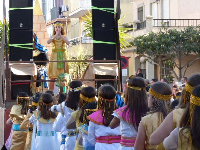 A lo largo de todo el recorrido, y gracias a que las carrozas iban musicalizadas, cada colegio representando en este cortejo, Eduardo Lobillo, Pozo Nuevo, San José de Calasanz, Pedro Antonio de Alarcón, Salesianas, Azorín y Luis Ponce de León, han podido bailar al ritmo de sus propias canciones y coreografías, lo que ha enriquecido bastante el paso del cortejo. A la parte musical se sumaban los músicos de la banda municipal "Maestro Enrique Galán", que abría el cortejo, y la batukada "Ketetumba".