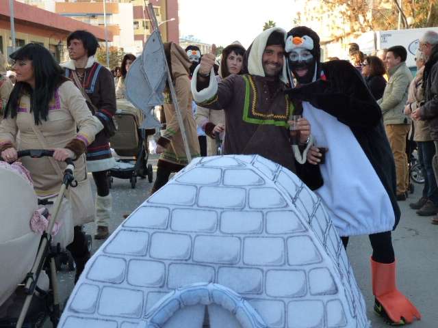 Exploradores, gnomos, egipcios, vaqueros, pingüinos, esquimales, ricas magdalemas, cupcakes y resposteros, toreros, caballeros de la Edad Media, "majorettes", wallys, médicos, enfermeras, embarazas, bebés, caníbales, muñecos de playmobil, la familia Picapiedra, personajes de Shrek, camaleones, y un largo etcétera han compuesto el desfile de este año que ha dado mucho brillo a esta Gran Cabalgata del Humor que cerraban las Sirenas adulta e infantil, Marta Lucero y Blanca Hernández, respectivamente,  con su corte de ninfas de honor.