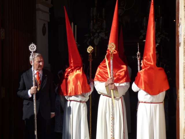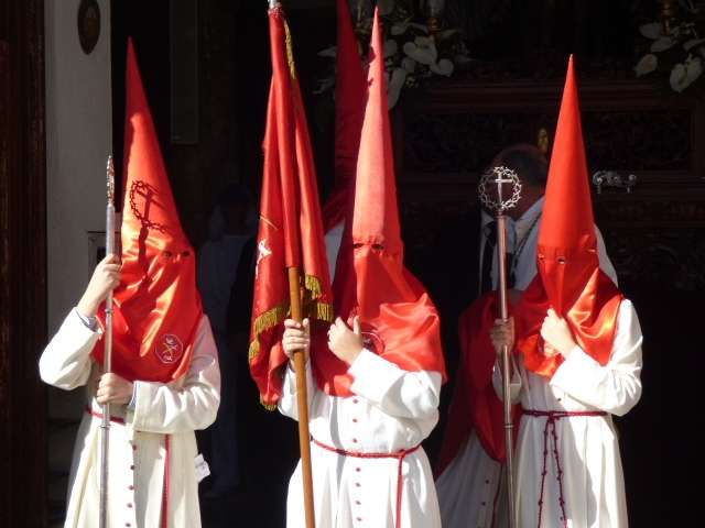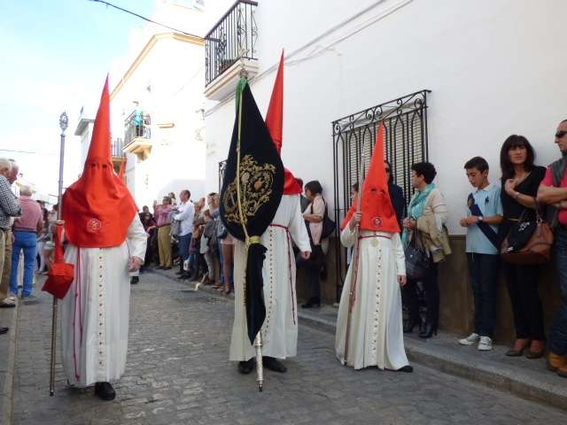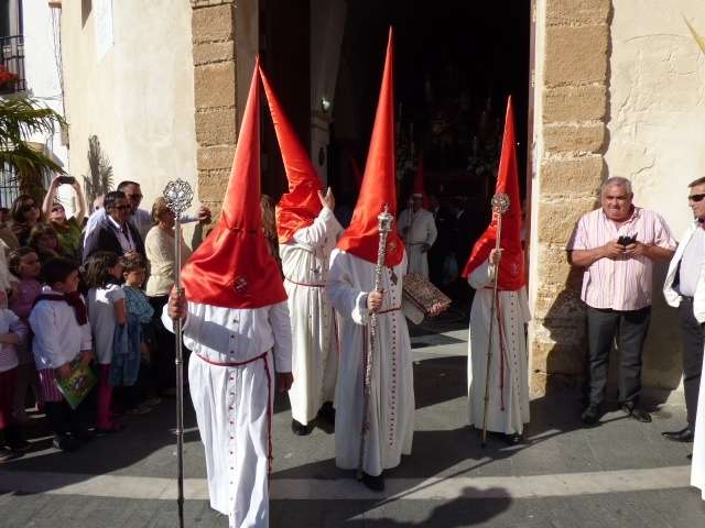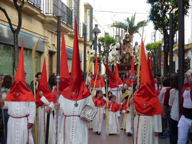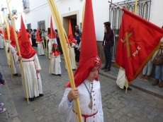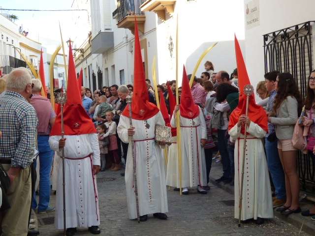 Unos 170 hermanos aproximadamente, entre nazarenos y costaleros, formaban el cortejo que se caracteriza por las túnicas blancas y capirotes rojos y por la presencia de palmas que portan mayores y niños. El Domingo de Ramos es aún un día de alegría entre los cofrades y muestra de ello es la amplia participación de jóvenes penitentes que dejan estampas entrañables a lo largo de todo un recorrido que se prolonga en unas tres horas y media.