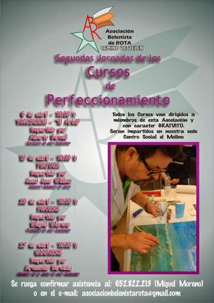 La afición belenista en Rota no decae durante todo el año y son muchos los ciudadanos que se afanan en ir preparando figuras y estructuras para montar el belén de cara a la próxima Navidad. Por ello, la Asociación de Belenistas de Rota "Camino de Belén", ha iniciado su segundo curso de perfeccionamiento que comenzó el pasado lunes 6 de abril para enseñar a los asistentes nuevas técnicas que les ayuden a mejorar sus conocimientos en este terreno.
