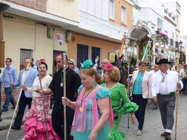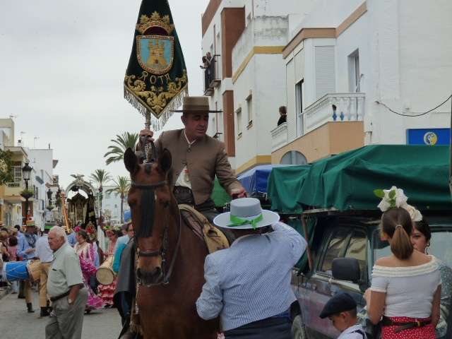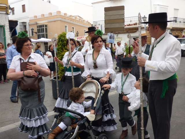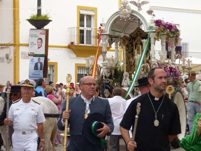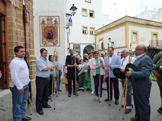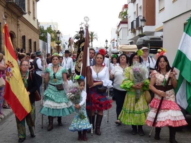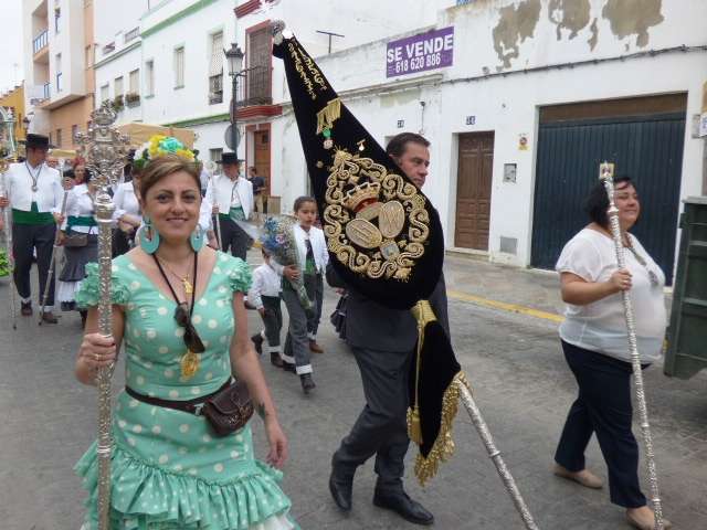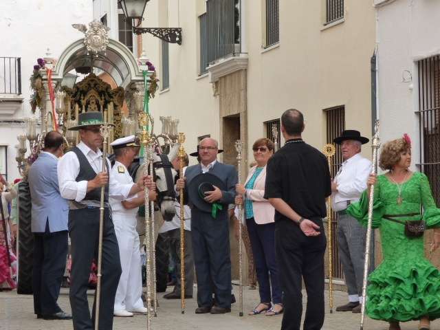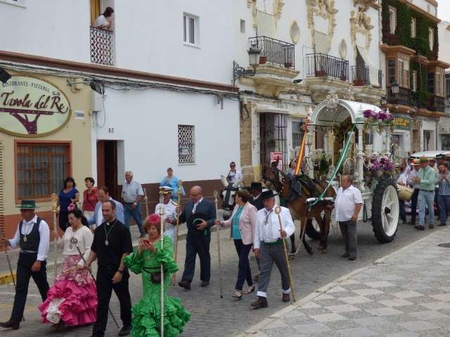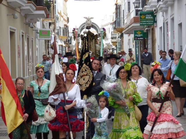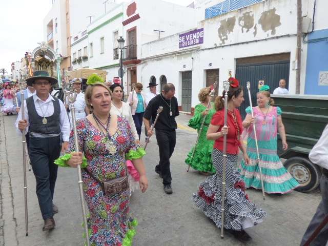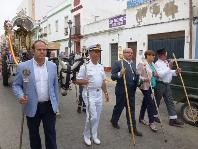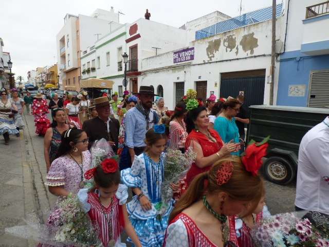 La carreta ha iniciado el cortejo pasadas las nueve y media de la mañana con varios caballos abriendo la comitiva seguidos de rocieros luciendo el típico traje para esta ocasión. A lo largo del itinerario previsto, el mismo que se estrenó el año pasado y que hizo que por primera vez tras varios siglos, el Simpecado llegara hasta la parroquia de Nuestra Señora de la O, la presidencia, compuesta por el director espiritual de la hermandad, Carlos Redondo, el hermano mayor, Juan Manuel Montes, dos concejales del Ayuntamiento de Rota y un representante de la Base Naval, ha ido haciendo paradas para realizar varias ofrendas. La primera de ellas ha tenido lugar en la capilla de la Caridad, seguida de visita a la Parroquia Mayor donde han depositado varios ramos de flores en las capillas del Sagrario, de la patrona Nuestra Señora del Rosario, en la del Nazareno y en la del Santo Entierro. En todas, los respectivos hermanos mayores de las hermandades representadas, han deseado a los rocieros un buen camino y protección para todos los roteños.
