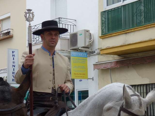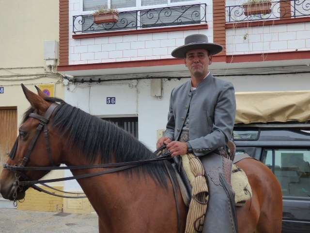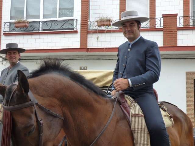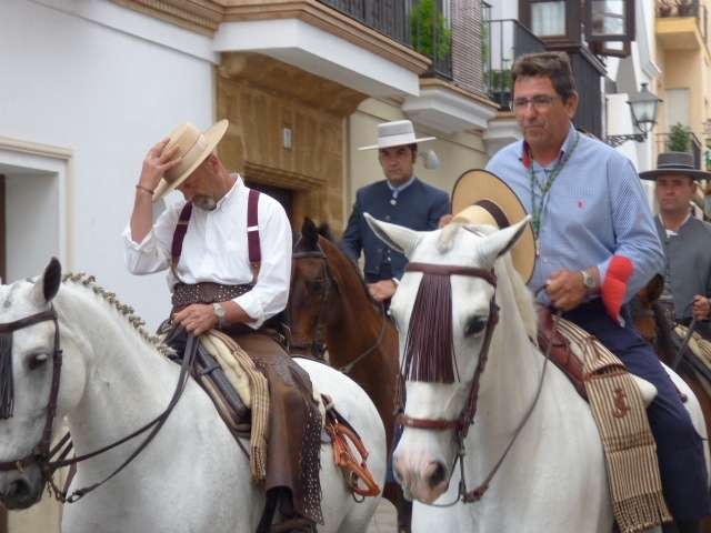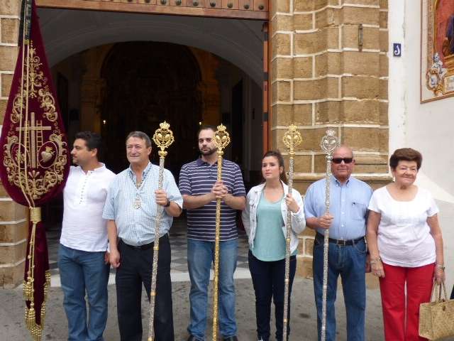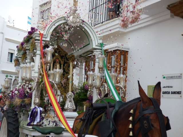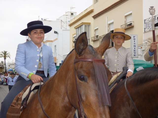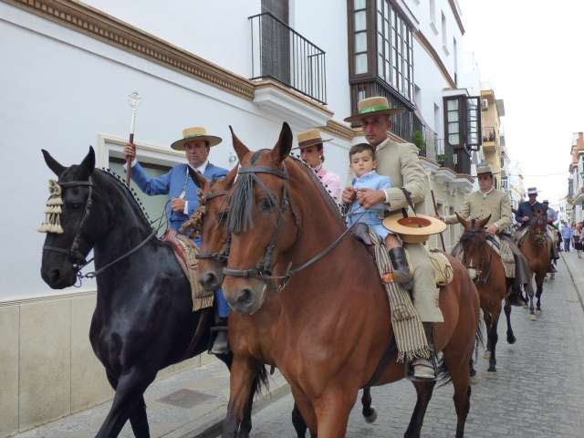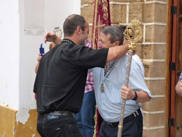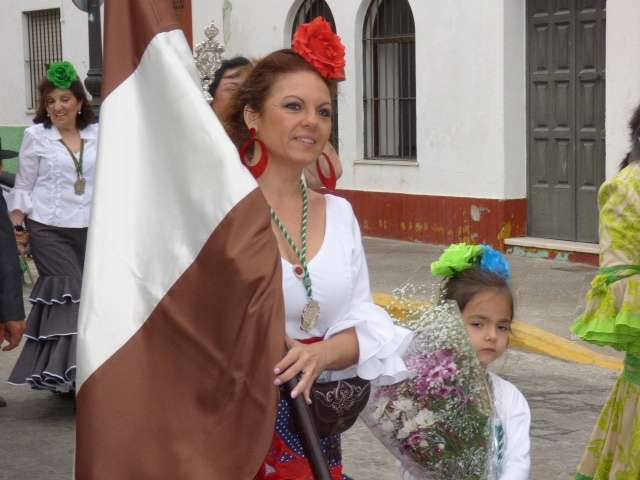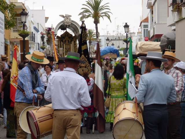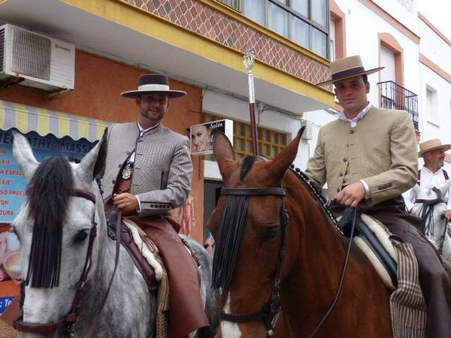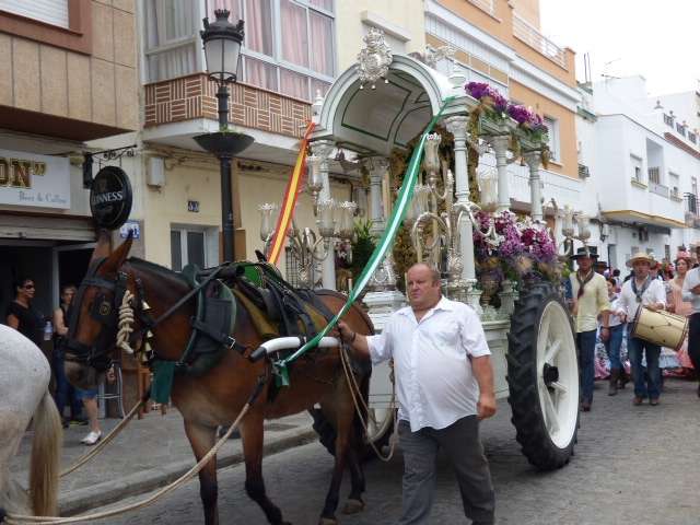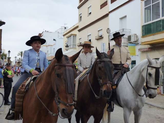 La carreta ha iniciado el cortejo pasadas las nueve y media de la mañana con varios caballos abriendo la comitiva seguidos de rocieros luciendo el típico traje para esta ocasión. A lo largo del itinerario previsto, el mismo que se estrenó el año pasado y que hizo que por primera vez tras varios siglos, el Simpecado llegara hasta la parroquia de Nuestra Señora de la O, la presidencia, compuesta por el director espiritual de la hermandad, Carlos Redondo, el hermano mayor, Juan Manuel Montes, dos concejales del Ayuntamiento de Rota y un representante de la Base Naval, ha ido haciendo paradas para realizar varias ofrendas. La primera de ellas ha tenido lugar en la capilla de la Caridad, seguida de visita a la Parroquia Mayor donde han depositado varios ramos de flores en las capillas del Sagrario, de la patrona Nuestra Señora del Rosario, en la del Nazareno y en la del Santo Entierro. En todas, los respectivos hermanos mayores de las hermandades representadas, han deseado a los rocieros un buen camino y protección para todos los roteños.