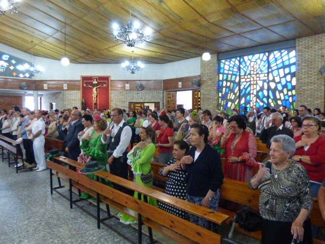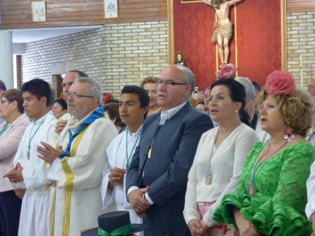La Hermandad de Nuestra Señora del Rocío ha celebrado esta mañana la Misa de Romeros y una vez terminada, han montado en la carreta el Simpecado que protegerá a los peregrinos en el camino. Una carreta que este año ha sido decorada por el hermano mayor de la Hermandad del Santo Entierro, José Manuel Sánchez Peña, además de por Antonio Lluyot y Pablo Barba, con productos de la huerta roteña como tomares, calabaza y parra de tintilla dándose así un toque más campestre al exorno.