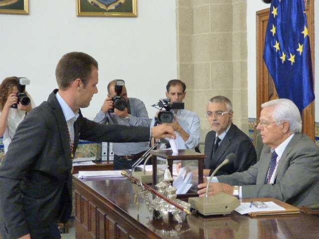 Tras el turno de intervenciones, llegaron las votaciones. Los 21 concejales depositaron en la urna la papeleta con el nombre de su candidato del que salió investido por mayoría absoluta, 12 votos, José Javier Ruiz Arana. Desde ese momento, proclamado por el secretario municipal y recogiendo el bastón de mando de manos del concejal Francisco Laynez, el socialista es el nuevo alcalde de Rota. Un sonoro aplauso llenó el salón capitular en ese momento, y la cara de emoción para el joven alcalde al encontrar su mirada con su esposa, en primera fila entre el público, fue inevitable. Pronto se recompuso el nuevo mandatario para iniciar un discurso serio lleno de buenas intenciones, de propuestas que ya ha venido desgranando en este tiempo y sobre todo, plagado de ganas de comenzar una nueva etapa.