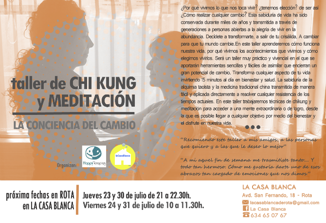 Por otro lado, este verano también habrá oportunidad para los adultos de participar en el "Taller de Chi kung y meditación. La conciencia del cambio”, que correrá a cargo del especialista en chi kung, tai-chi y acupuntura, José Ramón Barrera, en Rota. Se prevén dos monográficos durante el mes de julio: los días 23 y 30 de julio, en horario de noche; y los días 24 y 31 de julio, en horario de mañana. Las actividades serán también en la sede de "La Casa Blanca" y el plazo de inscripción ya está abierto.