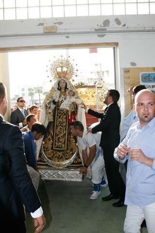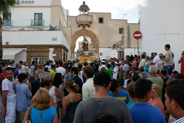 Con un fuerte calor, y acompañada por la banda de música de la Hermandad de Nuestro Padre Jesús Nazareno, la virgen, rodeada de fieles y curiosos, atravesaba la plaza Bartolomé Pérez para, desde el callejón del Castillo, enfilar el camino hasta el muelle por Fermín Salvochea y Gravina. Era precisamente en el puerto donde le esperaban miles de personas que todos los años se concentran allí para verla embarcar. Previamente, la imagen fue llevada hasta la puerta de la lonja pesquera, donde fue cuidadosamente bajada por sus costaleros y llevada hasta el pantalán en el que le esperaba el barco pesquero de los Hermanos Corbeto donde fue colocada sobre su base de madera. Durante estos últimos pasos, contó con el acompañamiento musical del grupo “Piando por Cai”, que le dedicó una salve marinera.