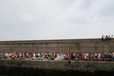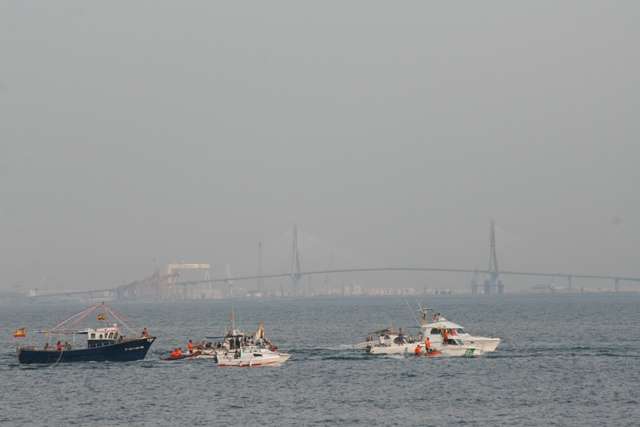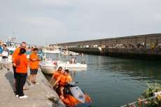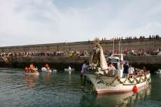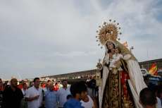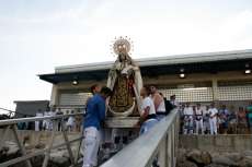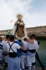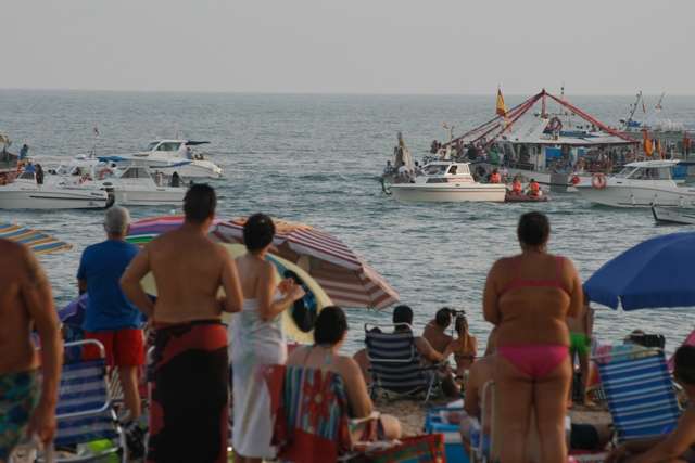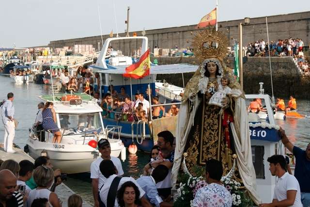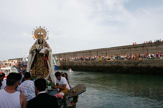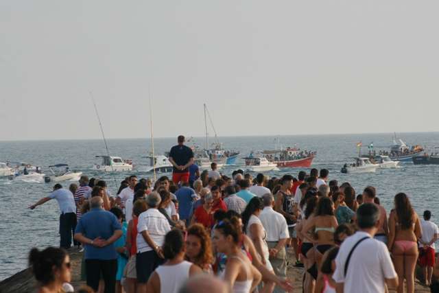 A partir de ahí, la Vvrgen emprendió su procesión marítima, acompañada de unos 50 barcos aproximadamente. Barcos pesqueros grandes, medianos y pequeños, una embarcación de la Marina Española, pequeños botes de aficionados a la mar, lanchas zodiac, el barco propiedad del Ayuntamiento, e incluso motos acuáticas acompañaron a la patrona marinera en un recorrido seguido por miles de personas desde la playa, y que llegó mas o menos hasta la altura de Santa Marta, punto en el cual emprendió el camino de retorno al puerto donde llegó pasadas las nueve de la noche.