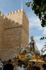 Una vez en tierra, continuó con la procesión, en este caso terrestre, por las calles Gravina, Fermín Salvochea, Arco de Regla, Higuereta, Blas Infante, plaza de Andalucía, Álvaro Méndez, Pozo de la Villa, plaza de España, Constitución, plaza Barroso, Pérez de Bedoya, plaza del Padre Eugenio, plaza Bartolomé Pérez, para regresar a su templo parroquial.