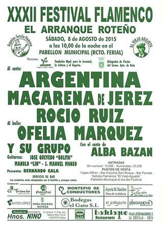 [Img #48486]Cartel de primer nivel en el tradicional festival flamenco “Arranque Roteño”, que este año 2015 alcanza su trigésimo segunda edición. Un festival con mucha solera y que todos los años atrae a los aficionados al flamenco no solamente de Rota sino de muchas localidades del entorno. Esta edición se celebrará el próximo sábado 8 de agosto, a las 22.00 horas, en el mismo lugar en el que se viene desarrollando desde hace ya muchos años, el pabellón municipal del recinto ferial. Como en años anteriores está organizado por la Tertulia Flamenca “Viejo Agujeta” en colaboración con la Fundación Municipal de Cultura y la delegación de Fiestas del Ayuntamiento de Rota.