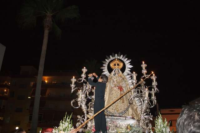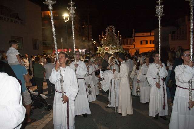 En una noche especial, y con miles de roteños y turistas en la calle, la Virgen del Rosario emprendía un recorrido original, pasando por calles y avenidas por las que no suele pasar. La ruta de vuelta a la parroquia de la O fue la siguiente: avenida Príncipes de España, Joan Miró, avenida de Sevilla, avenida San Fernando, María Auxiliadora (derecha), San Roque, Charco, Alcalde García Sánchez, plaza de Andalucía, Álvaro Méndez, plaza de España, Cuna, plazoleta Padre Eugenio, y plaza Bartolomé Pérez, desde donde, con el original ambiente propiciado por la presencia allí del Mercado Artesanal Quijotesco, la Patrona se recogía sobre las dos de la madrugada.