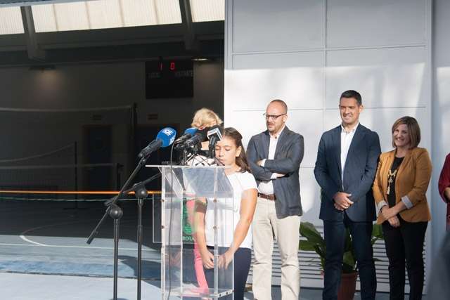 La comunidad educativa del colegio San José de Calasanz está de fiesta hoy. Alumnos, profesores, directivos y muchos padres fueron testigos esta mañana de la inauguración de su flamante nuevo pabellón polideportivo cubierto, en un solemne acto que contó con la presencia de la mayoría de la Corporación municipal, con el alcalde, Javier Ruiz Arana, a la cabeza, además de con la presidenta de la Diputación Provincial, Irene García, administración que ha financiado este proyecto, gracias a los fondos europeos FEDER, que han cubierto el 80% del coste y a sus recursos propios.