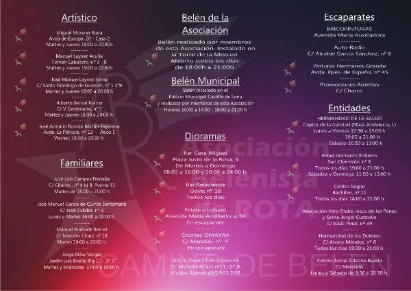 Con el fin de fomentar la tradición de montar el belén y que los ciudadanos puedan disfrutar de ver nacimientos típicos de estas fechas como una actividad más de ocio, la asociación de belenistas de Rota "Camino de Belén" ha vuelto a editar una guía en la que se recogen los distintos belenes y dioramas que durante estas semanas estarán abiertos al público.