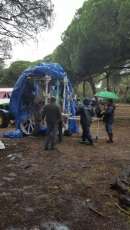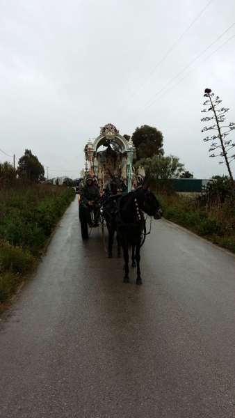 De momento, los tramos de camino que se están encontrando los peregrinos están en buen estado así que es sólo la lluvia la que les está impidiendo hacer las paradas de convivencia que marcan la peregrinación normal. Ayer, el recorrido se hizo mucho más rápido que en ediciones anteriores, y lo que antes se tardaban 3 o 4 horas, este año se está haciendo en poco más de un par de ellas, pero según el hermano mayor, el ambiente está siendo bueno y anoche, incluso con algo de lluvia, se montó el campamento, las tiendas de campaña -aunque algunos peregrinos han dormido en sus coches-, y hubo convivencia en torno a las velas de peticiones que se encienden por los hermanos, muchas de ellas, en representación de devotos que no hacen el camino pero que de alguna forma, acompañan al Simpecado en su peregrinación. Tras rezar el rosario, hubo rocieros que se quedaron despiertos hasta altas horas y disfrutaron de la primer noche en el camino y hoy, temprano, y sin poder celebrar la misa de por la mañana debido a la cantidad de agua que estaba cayendo, han iniciado el segundo día de peregrinación en el que sí habrá cambios.