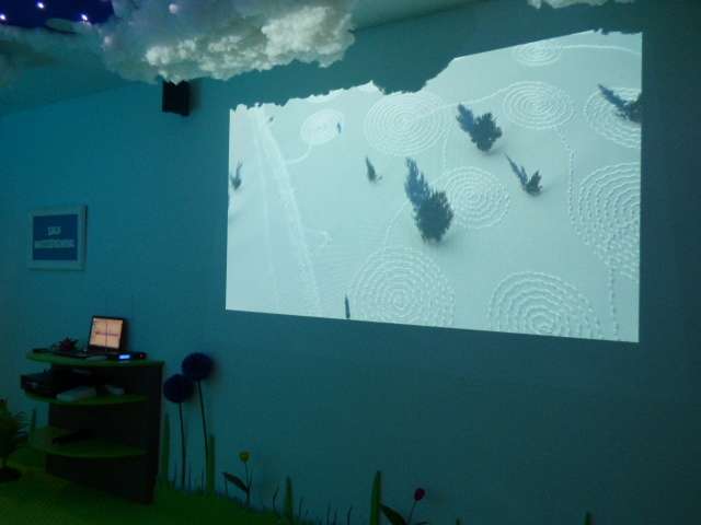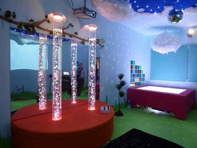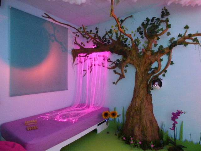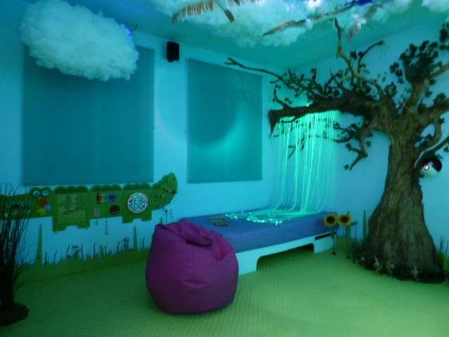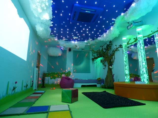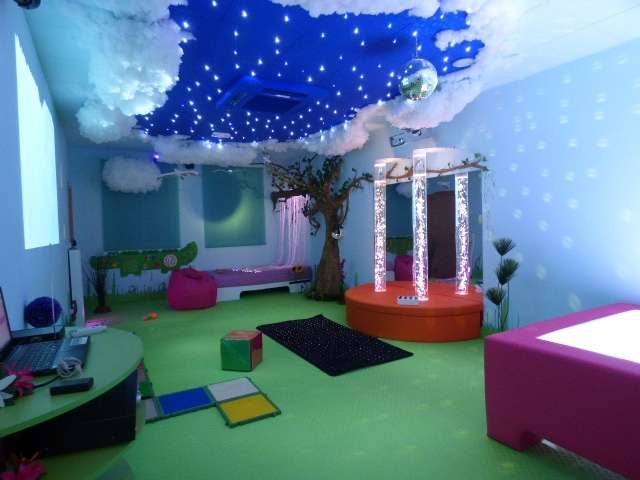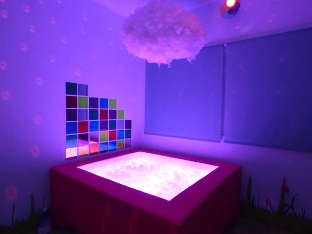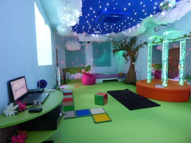 Se trata de una sala habilitada que cuenta con un sistema informático desde el que se puede cambiar las luces y el sonido ambiente, y que cuenta además con un sistema de teatro sensorial, un tubo de burbujas, una cortina y alfombras de fibra óptica, una cama de agua vibroacústica, una piscina de bolas con luces y sonido que cambian en función de la interacción de la persona, un panel interactivo de luz y sonido, un pasillo de estimulación táctil, un proyector, un kit sensorial de masaje, un circuito para trabajar el equilibrio y en definitiva, un mundo de luz, sonido y color, de estimulación pensado para estos chicos con necesidades especiales para su educación y desarrollo.