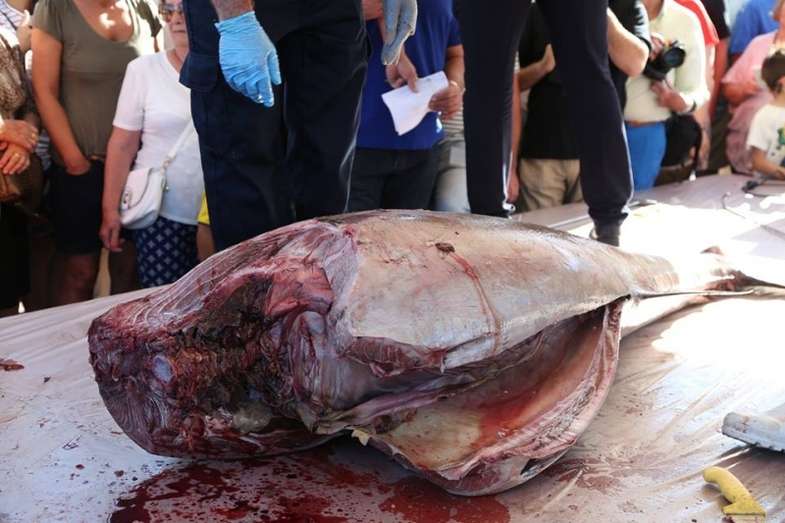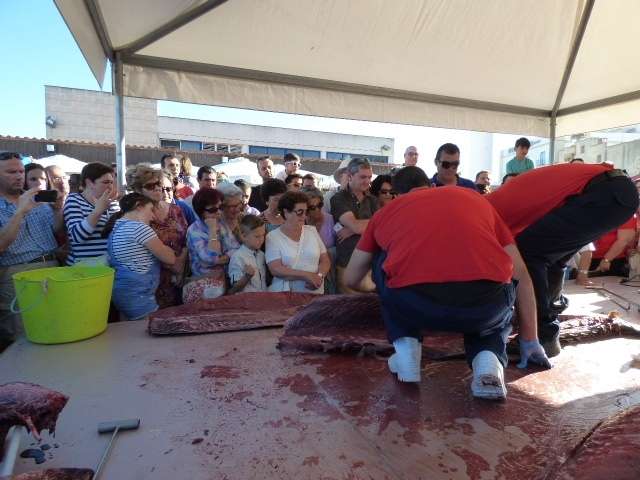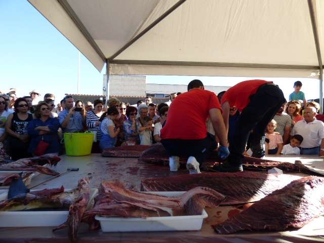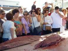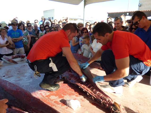 Antes de las siete de la tarde ya había ciudadanos en torno a la carpa colocada tras la lonja donde estaba un atún rojo de 220 kilos que pescadores de la Cooperativa de Pescadores "Mar de Rota" se encargaron posteriormente de despedazar según la técnica milenaria japonesa conocida como ronqueo.
