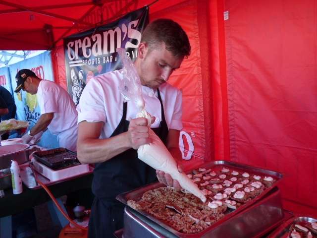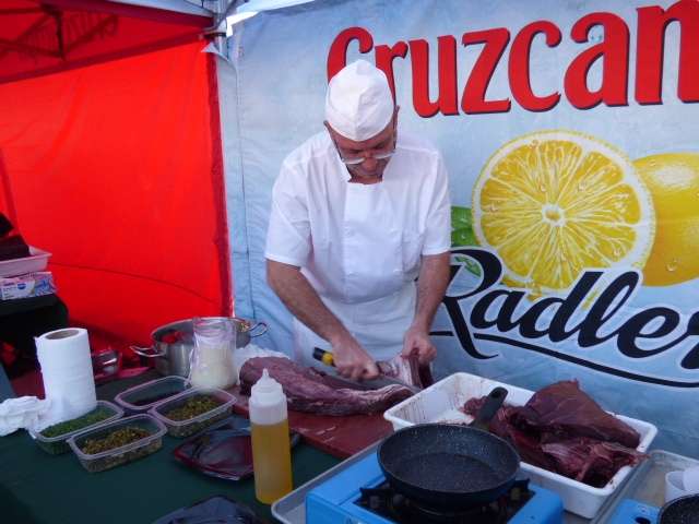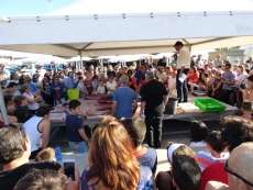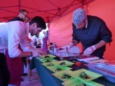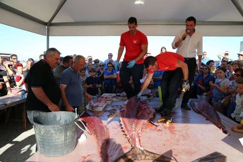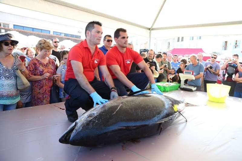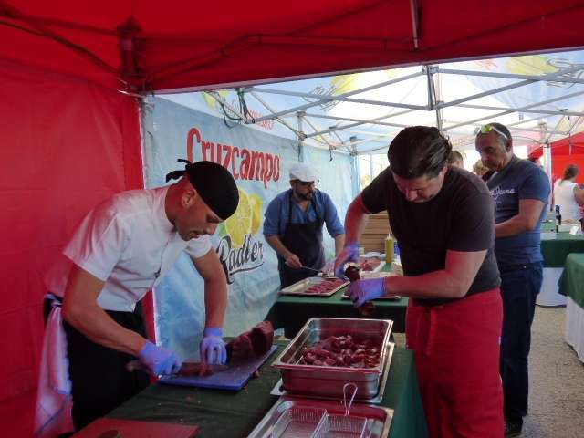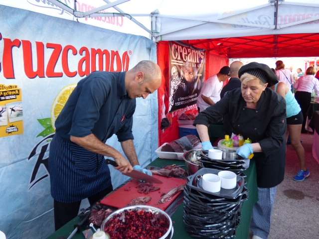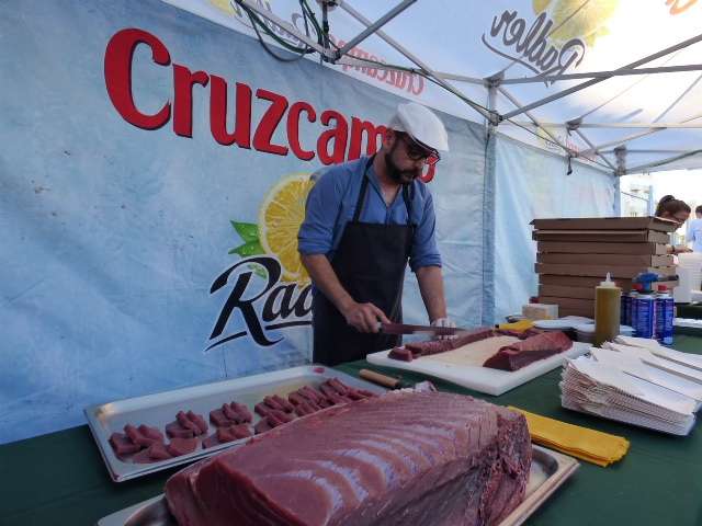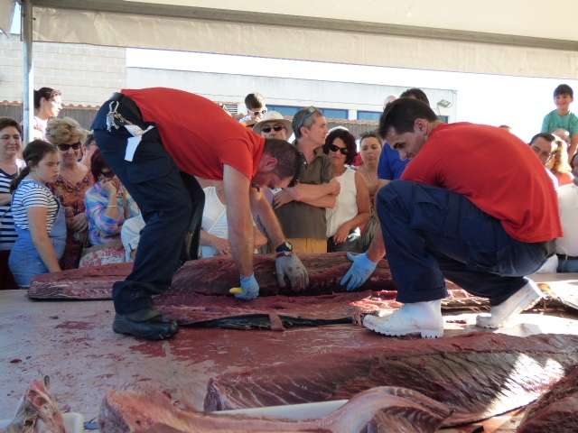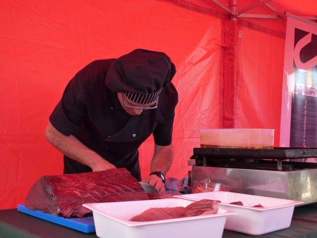 Quizás la altura del escenario que se colocó no fue suficiente para que todos los ciudadanos que acudieron pudieran ver el espectáculo así que sólo unos pocos, los que consiguieron el sitio más cercano en torno a la carpa pudieron ver directamente el despedazado de una gran pieza de atún que en poco más de media hora quedó troceada. Fue a partir de ahí cuando comenzó la segunda parte de esta novedosa actividad con la entrega de 10 kilos de atún a la decena de bares que se apuntaron para participar y cocinar en directo su plato con el atún como ingrediente principal. Entre ellas, una coca de verduras con atún rojo y rúcula, una tosta de pan de cristal con centeno con ajo blanco, sashimi de atún rojo, microbrotes de wasabi y mostaza y caviar de sésamo, un risotto de calabaza roteña sobre purrusalda de ortiguila y ventresca de atún rojo con arena de aceitunas negras, el arranquetún, una chistorra de atún rojo, un pincho moruno de atún rojo con cous cous de coliflor y curry rojo, sushi de atún rojo, un taco asiático de vegetal y atún rojo o platos bautizados como "el mar y la huerta" o "el atún y el gato".