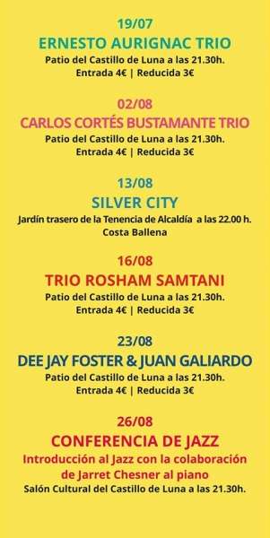 El ciclo concluirá el 26 de agosto con una conferencia de jazz titulada "Introducción al Jazz" con la colaboración de Jarret Chesner al piano, que se llevará a cabo en el salón cultural del Castillo de Luna, a las nueve y media de la noche.