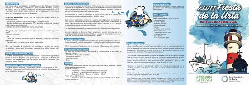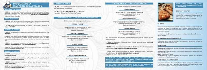 [Img #60008]La próxima semana se celebra la Fiesta de la Urta en su 47 edición y con tal motivo, desde el Ayuntamiento de Rota se han editado unos trípticos en los que se recoge toda la programación, con actividades y actuaciones que durante los días de celebración, es decir, del 4 al 7 de agosto, tendrán lugar en las diferentes plazas de la localidad.