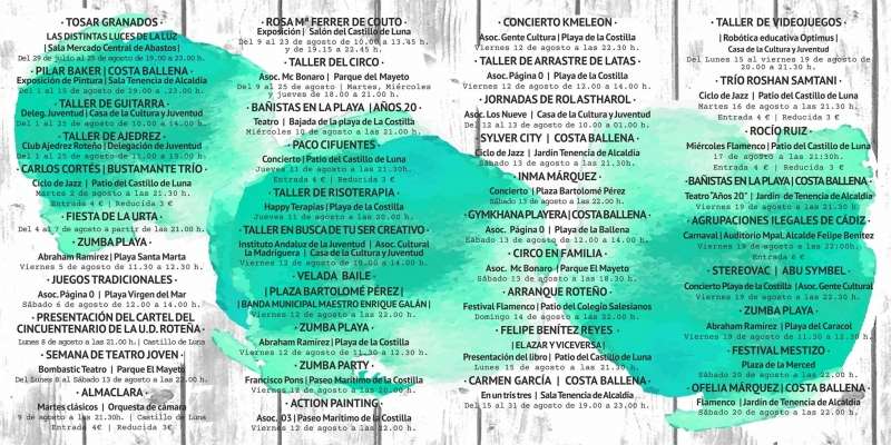 Para completar el resto de actividades en este mes veraniego por antonomasia, las plazas de la Costilla y de Costa Ballena acogerán obras de teatro a pie de calle y espectáculos infantiles, los conciertos de Inma Márquez y una actuación muy especial de la banda municipal de música "Maestro Enrique Galán", pensada para que sea mucho más interactiva. Para ello, según la delegada,  se ha preparado una velada baile, para que personas que participan en los talleres municipales de baile y todos los que lo deseen puedan bailar con los temas que la banda municipal interprete desde el escenario de la plaza Bartolomé Pérez.