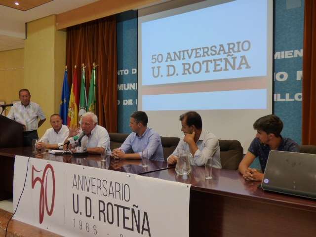 Presentado por Juan Macías, veterano roteño relacionado con el fútbol local, tenía lugar el primero de los actos que la comisión organizadora creada para celebrar esta fecha tiene previsto llevar a cabo en los próximos meses. Fue Juan Reales, fundador, primer capitán de la U.D. Roteña, presidente del club y actual presidente de la peña con el mismo nombre, el que se encargó de recordar con detalles cómo fueron aquellos duros inicios de un equipo local que pronto, comenzó a dar satisfacciones a sus seguidores. En estos años, decía Juan Reales, ha habido momentos duros y complicados, pero siempre supieron tirar hacia adelante gracias al empeño y esfuerzo de muchas personas que hoy ya no están. A todos ellos se les dedicó un aplauso en señal de reconocimiento porque, decían, la Roteña no sería el club que es, si no hubiera contado con tanta gente implicada.