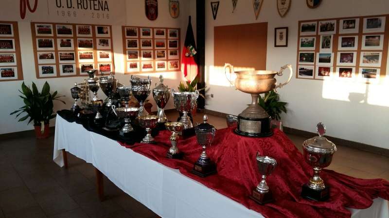 En la tarde de ayer lunes se llevó a cabo la inauguración de la exposición que se ha organizado con motivo de la celebración del cincuentenario que cumple la U.D. Roteña. Una muestra que recoge trofeos ganados a lo largo de estos 50 años de trayectoria del club local, fotografías con jugadores del primer equipo, escalas inferiores, técnicos, directivos, afición, etc., y curiosidades con las que se puede echar la vista atrás cinco décadas cuando surgió esta entidad deportiva que durante los próximos meses celebrará una fecha tan especial.