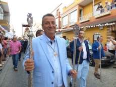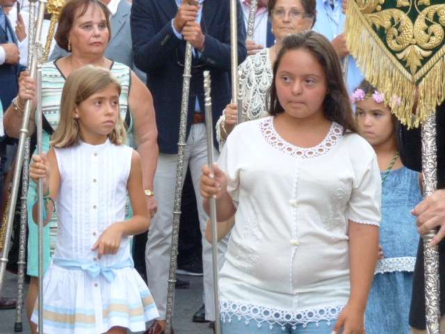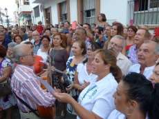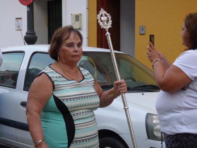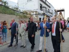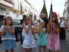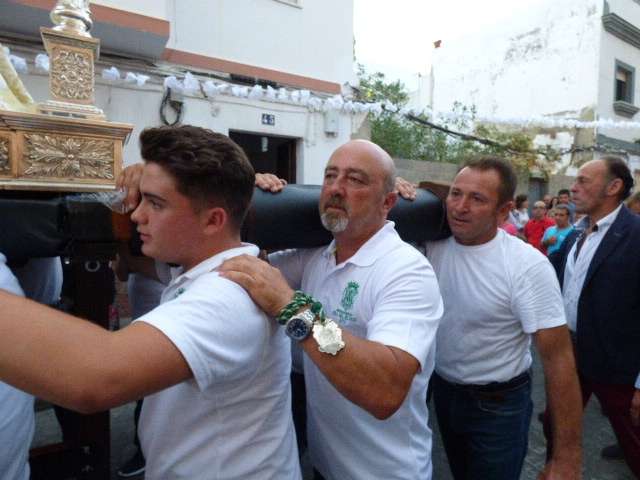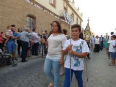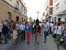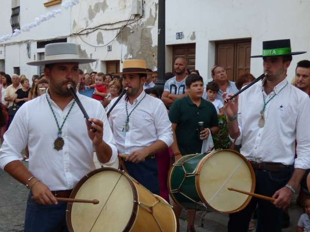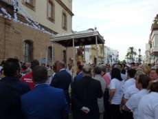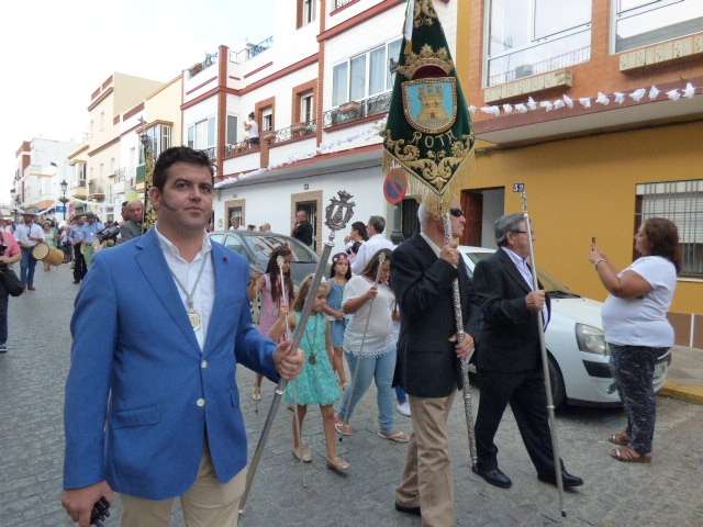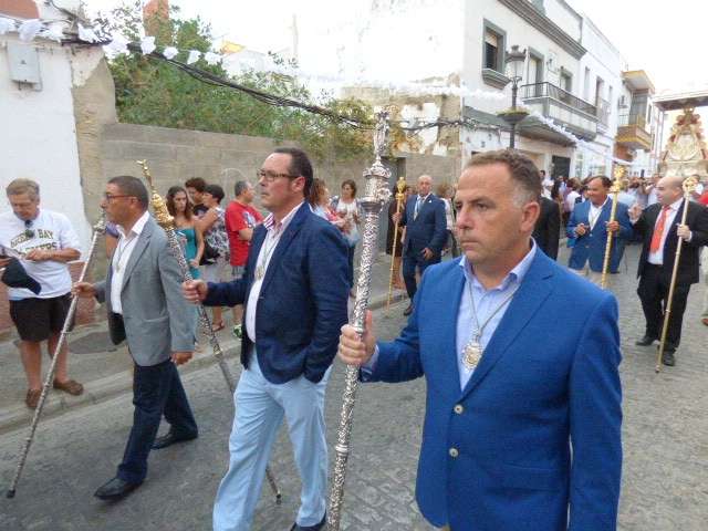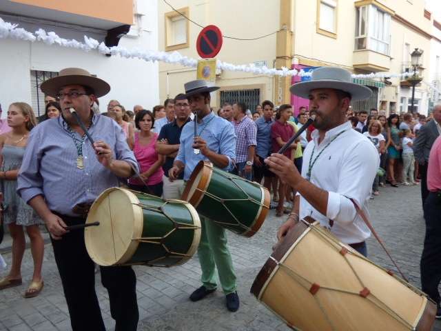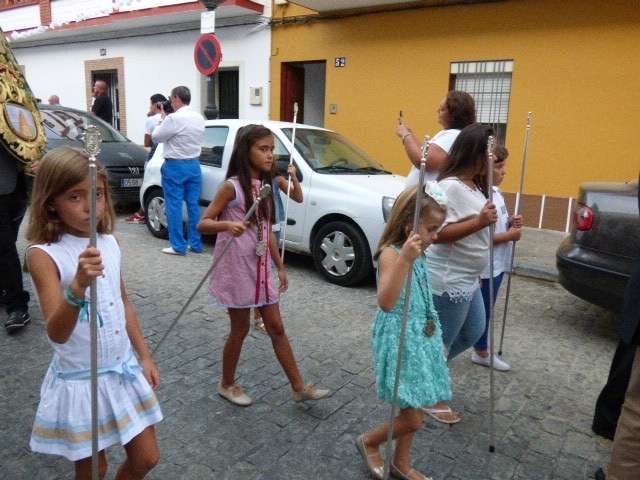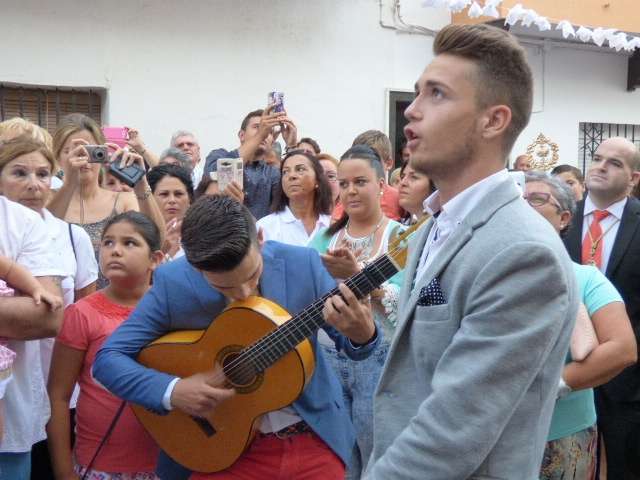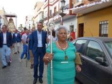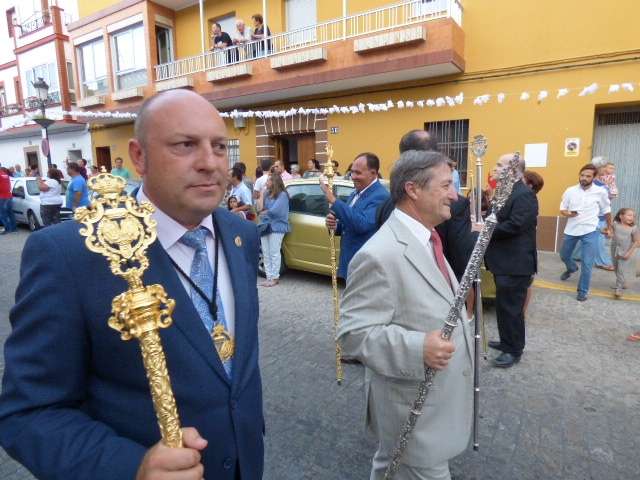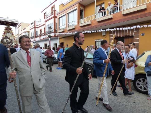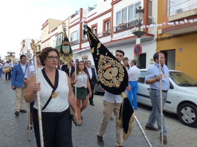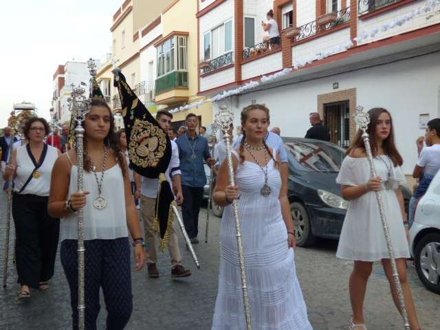 Algo más de medio centenar de personas formaban el cortejo que precedía el paso y que estaba formado por devotos, hermanos rocieros, representantes de las hermandades del Santo Entierro y del Amor, con quienes está hermanada, y miembros de la Hermandad del Rocío de Lebrija. En un ambiente de celebración, la virgen del Rocío avanzaba por las calles de la localidad cada vez con mayor número de público que la esperaba a pie de acera mientras espontáneos iban dedicándoles canciones y plegarias cantadas a su paso. Y es que aparte del grupo de cinco piteros de la hermandad que acompañaron musicalmente a la Blanca Paloma, y del coro rociero de la hermandad, fueron varios los artistas reconocidos en la localidad los que se pararon para aportar su granito de arena al engrandecimiento de esta procesión veraniega cantando a la virgen.