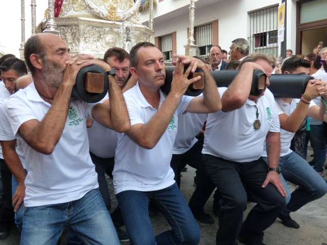 Cargada por hermanos rocieros, las cuadrillas de hombres y mujeres dirigidas por Alfonso García de Quirós se fueron alternando a lo largo del itinerario que a última hora tuvo algún cambio en el recorrido, pero que no fue problema para que el centro estuviera lleno de gente para seguirla.
