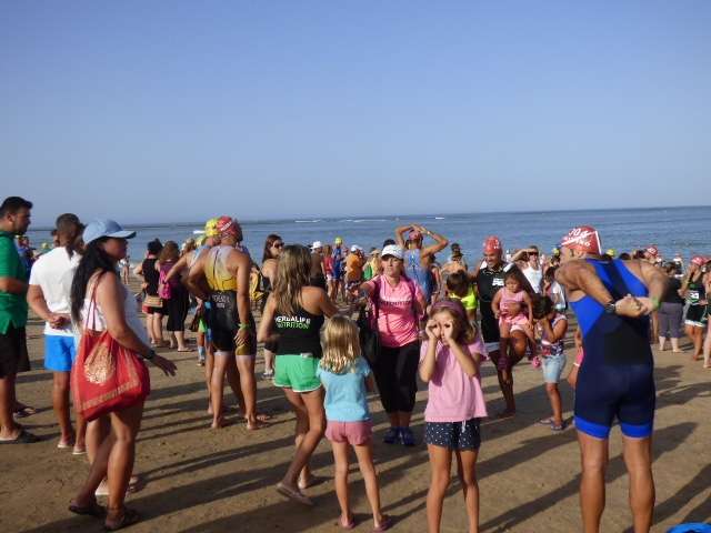 Desde primera hora del día, y con un calor que ya apretaban, los corredores retiraban sus dorsales y el público llegaba a esta zona de Rota que por un par de horas se ha visto algo alterada debido a la necesidad de cortar el tráfico para controlar el circuito por el que los triatletas correrían en bici y a pie.