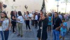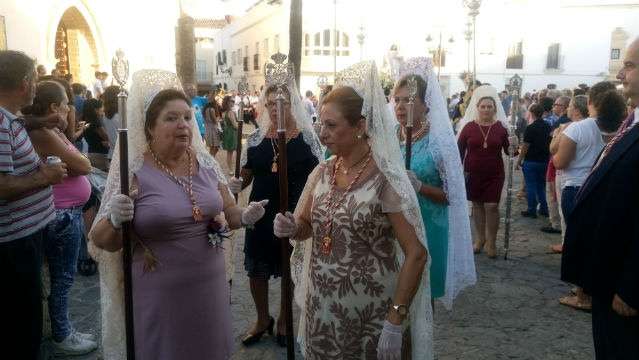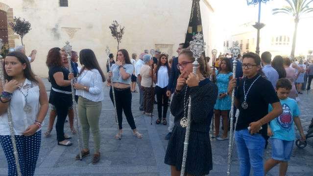 Mujeres de mantilla dieron color y realce a un cortejo en el que se pudieron ver a miembros de la Agrupación Parroquial Nuestra Señora de la Merced, entre las que se encontraba su presidenta, María del Carmen Vera, así como jóvenes cofrades además de una representación de las hermandades con las que comparte sede canónica en la iglesia de Nuestra Señora de la O, como la del Santo Entierro de Cristo y Soledad de María Santísima, San Isidro Labrador, la Hermandad del Nazareno y la de la patrona, Nuestra Señora del Rosario.