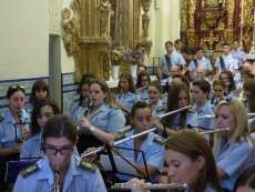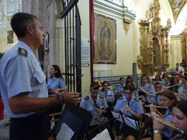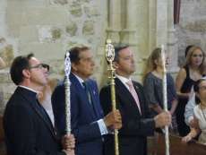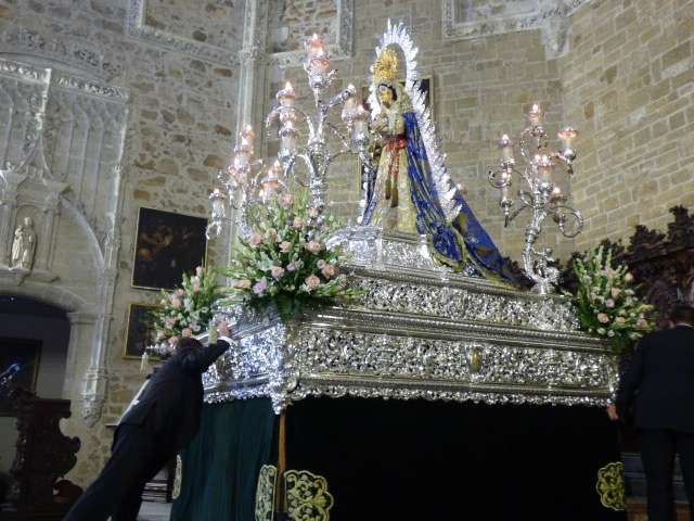 A los sones de la banda municipal de música "Maestro Enrique Galán", y con el himno el Rosario "Patrona, Señora y Madre" cantado en un par de ocasiones, los costaleros guiados por los capataces y contraguías han recorrido con buen tino el pasillo central de a iglesia hasta llegar al altar donde tras varias maniobras, han dejado el paso centrado presidiendo desde hoy esta parroquia emblemática.