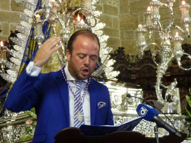 Mucho sentimiento ha puesto el pregonero, profesor de Lengua y Religión en Sevilla, licenciado en Filología Hispánica y con estudios de Teología cuyos conocimientos se han dejado ver en el pregón de una persona joven, pero con experiencia en este arte de pregonar. Ciudades como Bornos, Sevilla, Villamartín, Sanlúcar o Arcos han conocido en algunos casos su oratoria y en otros, su arte como vestidor, ya que a su trayectoria cofrade siendo hermano de varias hermandades, se le suma la de vestir a varias imágenes por las que ha mostrado un profundo fervor.