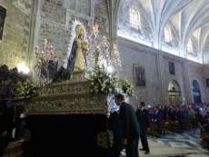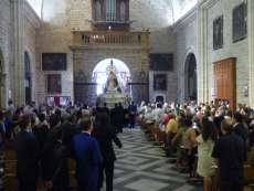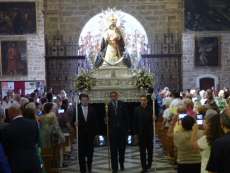 Tras la eucaristía de las 12 de la mañana, y con una iglesia llena de fieles y devotos, la cuadrilla de costaleros del paso de la virgen del Rosario han iniciado el traslado de la patrona de la localidad a un Altar Mayor que la acogerá hasta que el próximo 7 de octubre salda a procesionar por las calles del municipio el día de su festividad.