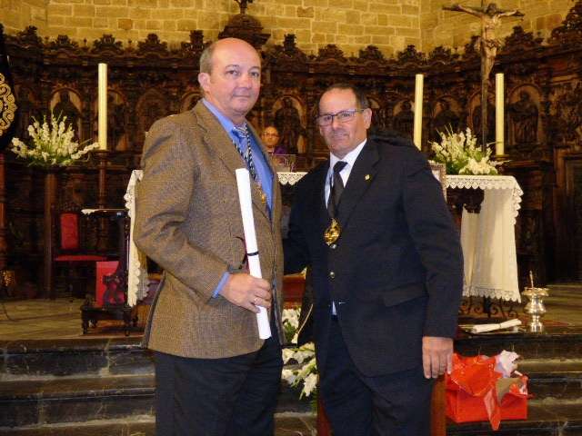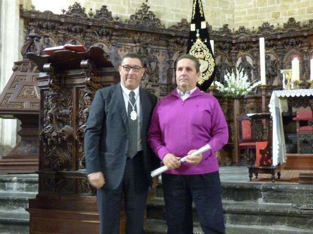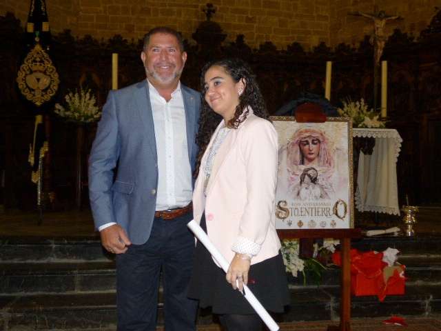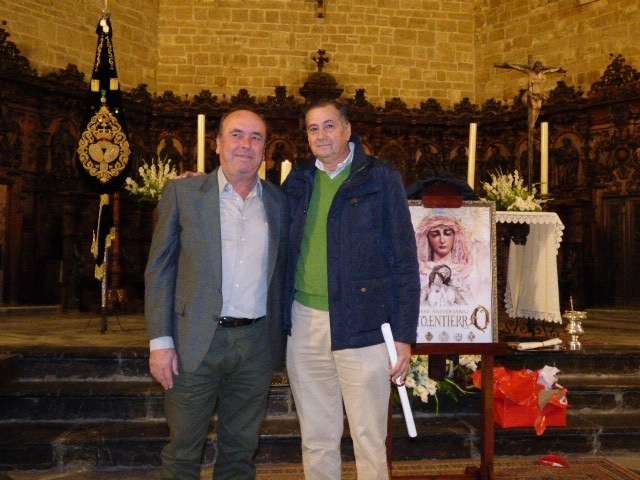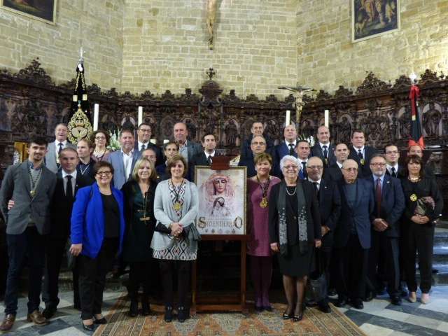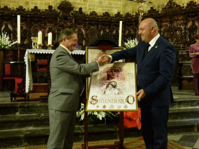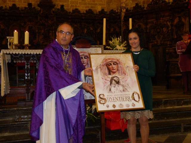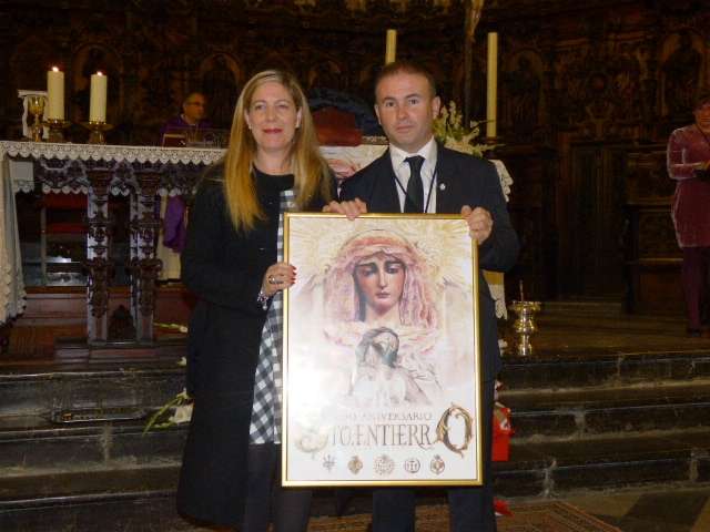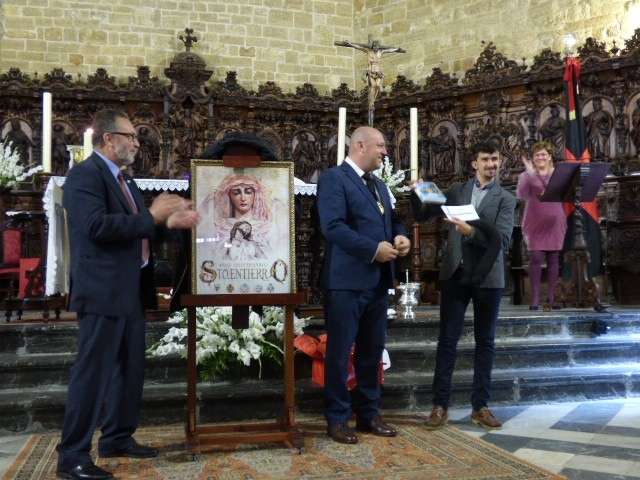 Posteriormente, el cura párroco de la O, Idelfonso González, y el hermano mayor del Santo Entierro, José Manuel Sánchez Peña, han descubierto el cartel conmemorativo de estos cuatro siglos desde que un grupo de roteños fundara la hermandad, cuyo autor ha sido el joven Mario Muñoz. El cartel, que también se ha editado en una colgadura de 4 por 2 metros que se ha deslizado en la balaustrada del órgano de la iglesia, pero que en la próxima semana lucirá en la fachada de la parroquia, recoge una imagen de los dos titulares de la hermandad, al Cristo Yacente y a Soledad de María Santísima, pintado en acuarela. Un resultado que ha gustado a la junta de gobierno y a los integrantes de la comisión organizativa de los actos que han felicitado al autor de la obra que a modo de agradecimiento, ha recibido un par de regalos, entre ellos, un costal, ya que Mario Muñoz es un joven vinculado a las cofradías locales, así como la medalla conmemorativa.