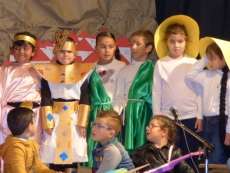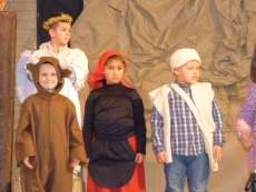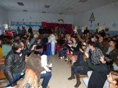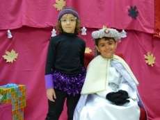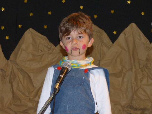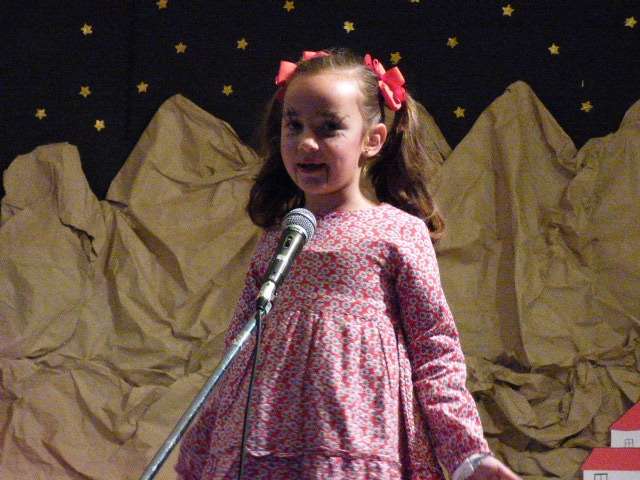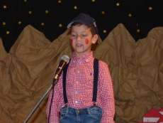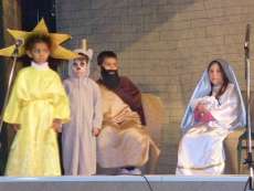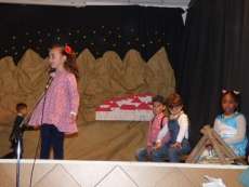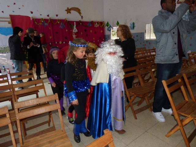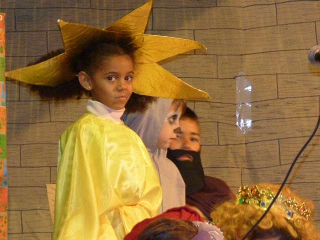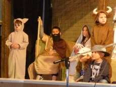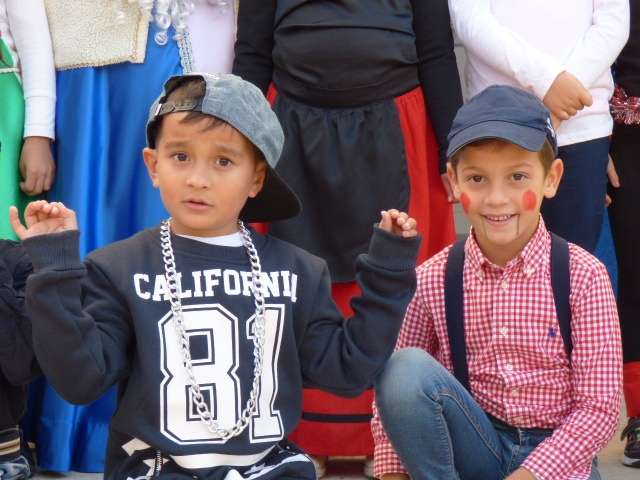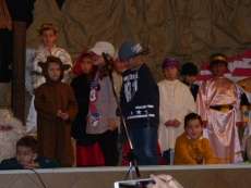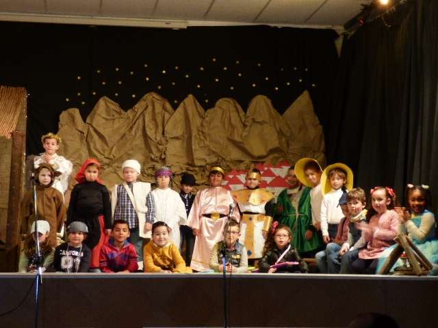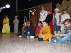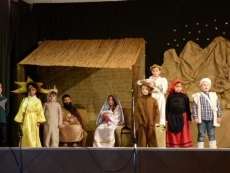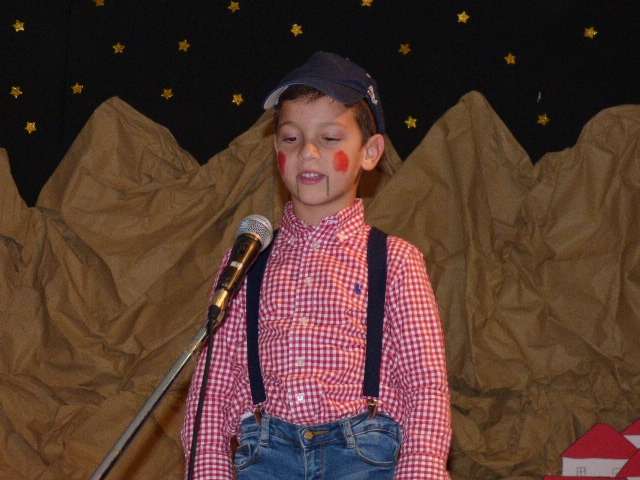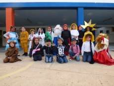 La historia ha sido la de un niño que al poner el belén se da cuenta de que le faltan algunas figuras que están rotas del año pasado y decide completarlo con otros juguetes y muñecos que nada tienen que ver con la Navidad. Aparecen en escena rockeros, raperos, chinos, egipcios o marroquíes, que se suman a los tradicionales pastorcitos, María y Jesús, la mula y el buey, la estrella, el Niño Jesús y los Reyes Magos que cuando van a adorar al Jesús ven un portal un tanto peculiar en el que están mezcladas personas de diferentes razas y procedencias. Lo importante, al final, y como moraleja, es que Jesús está para todos por igual y ese es el mensaje con el que los alumnos de 1º de Primaria han celebrado la Navidad. Al final y tras probar con cuál sería la mejor forma de cantar un villancico teniendo como protagonistas a los raperos, rockeros y funky, escenas que hicieron reír al público, decidieron que lo mejor, era cantar un al estilo más tradicional para felicitar la Navidad.